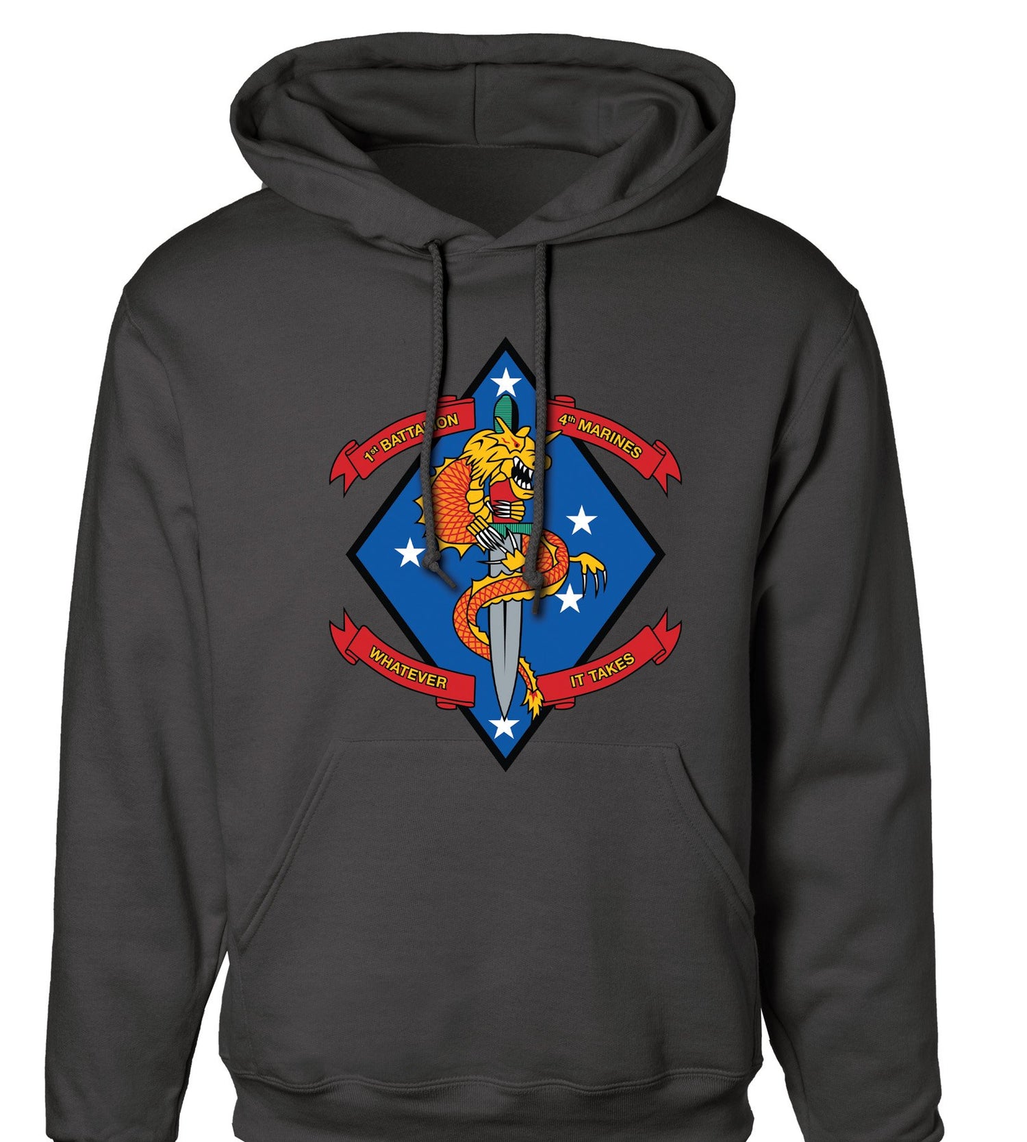 Continue to showcase your pride and dedication with this hoodie featuring the 1st Battalion 4th Marines patch. This hoodie can be personalized to also include your location and year.