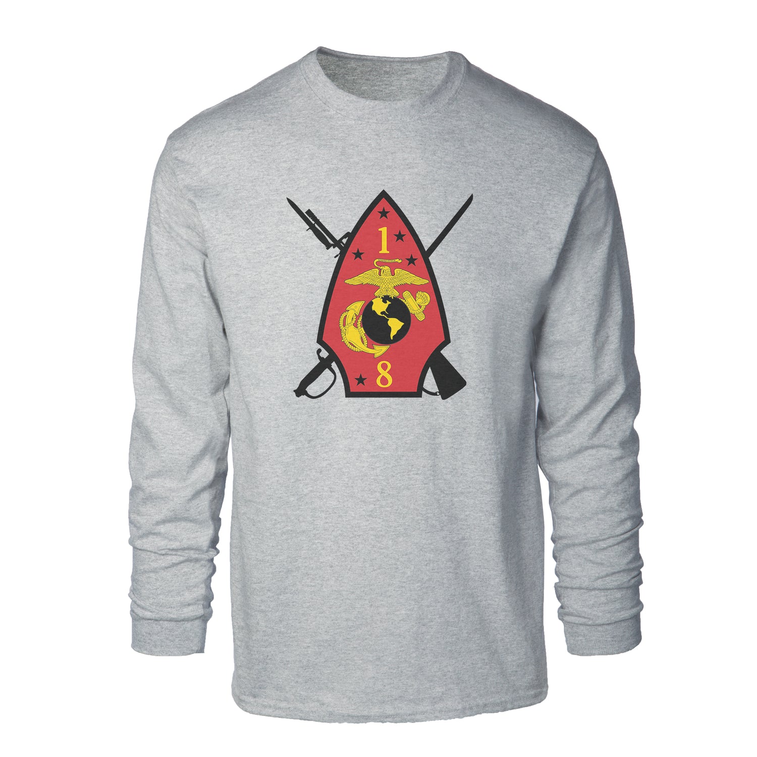 Your USMC collection won't truly be complete until you add this great Long Sleeve T-shirt. This t-shirt features the 1st Battalion 8th Marines patch and can be personalized with your location and year.