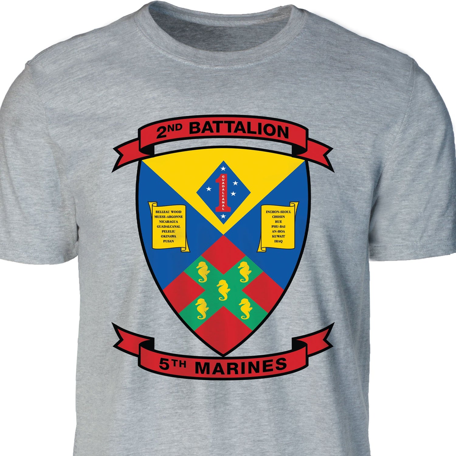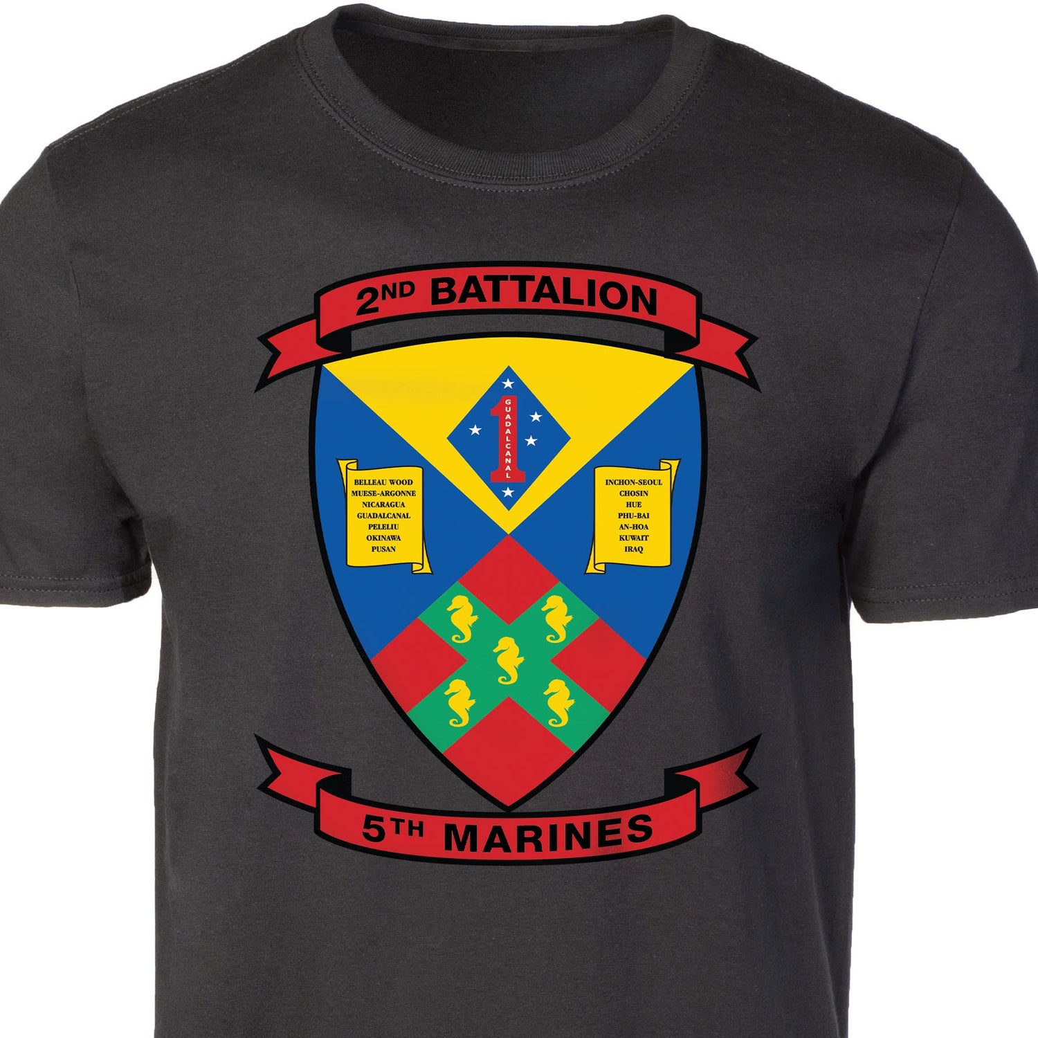 Your USMC collection won't truly be complete until you add this great T-shirt. This t-shirt features the 2nd Battalion 5th Marines patch that can be personalized with your location and year.