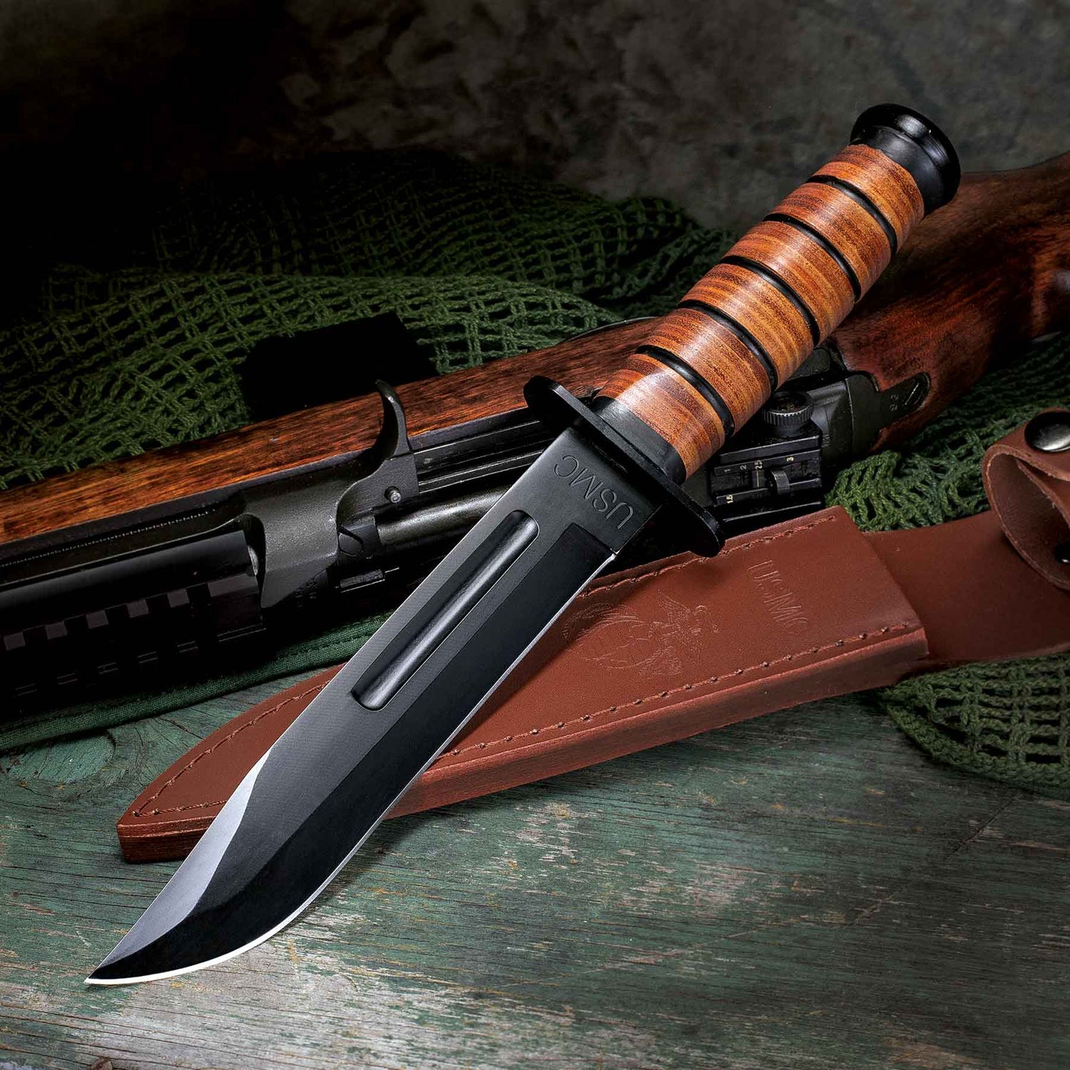 This classic USMC straight edge knife features a rock solid 420 stainless steel fixed blade with a heat treated black finish. The 7" clip point blade is razor sharp and includes a heavy blood groove. The genuine leather handle is stacked just like the classic knives traditionally carried by Marines, complete with a protective hand guard and cast pommel. This top quality fixed blade knife comes to you with a handsome embossed leather sheath.