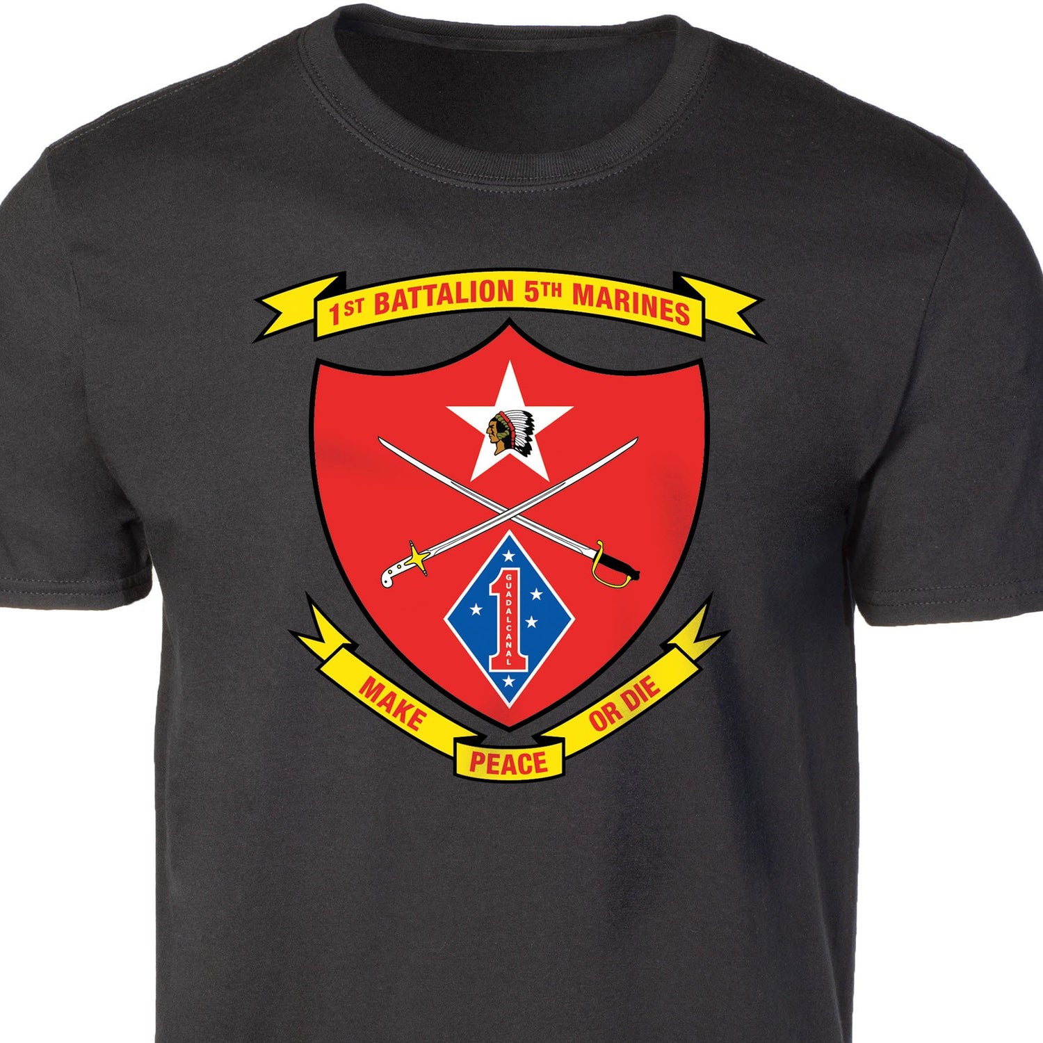 Your USMC collection won't truly be complete until you add this great T-shirt. This t-shirt features the 1st Battalion 5th Marines patch that can be personalized with your location and year.