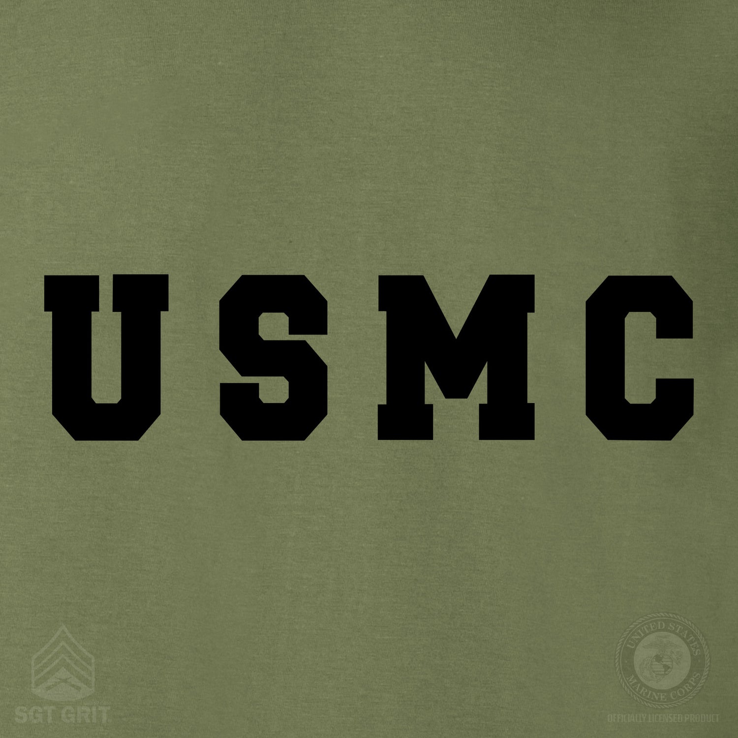 The initials for the United States Marine Corps are printed in bold black letters on the upper front of our OD Green USMC Bold Letters T-shirt from SGT GRIT. This is a classic short-sleeve crew-neck T-shirt style. Sizes range up to 5XL.