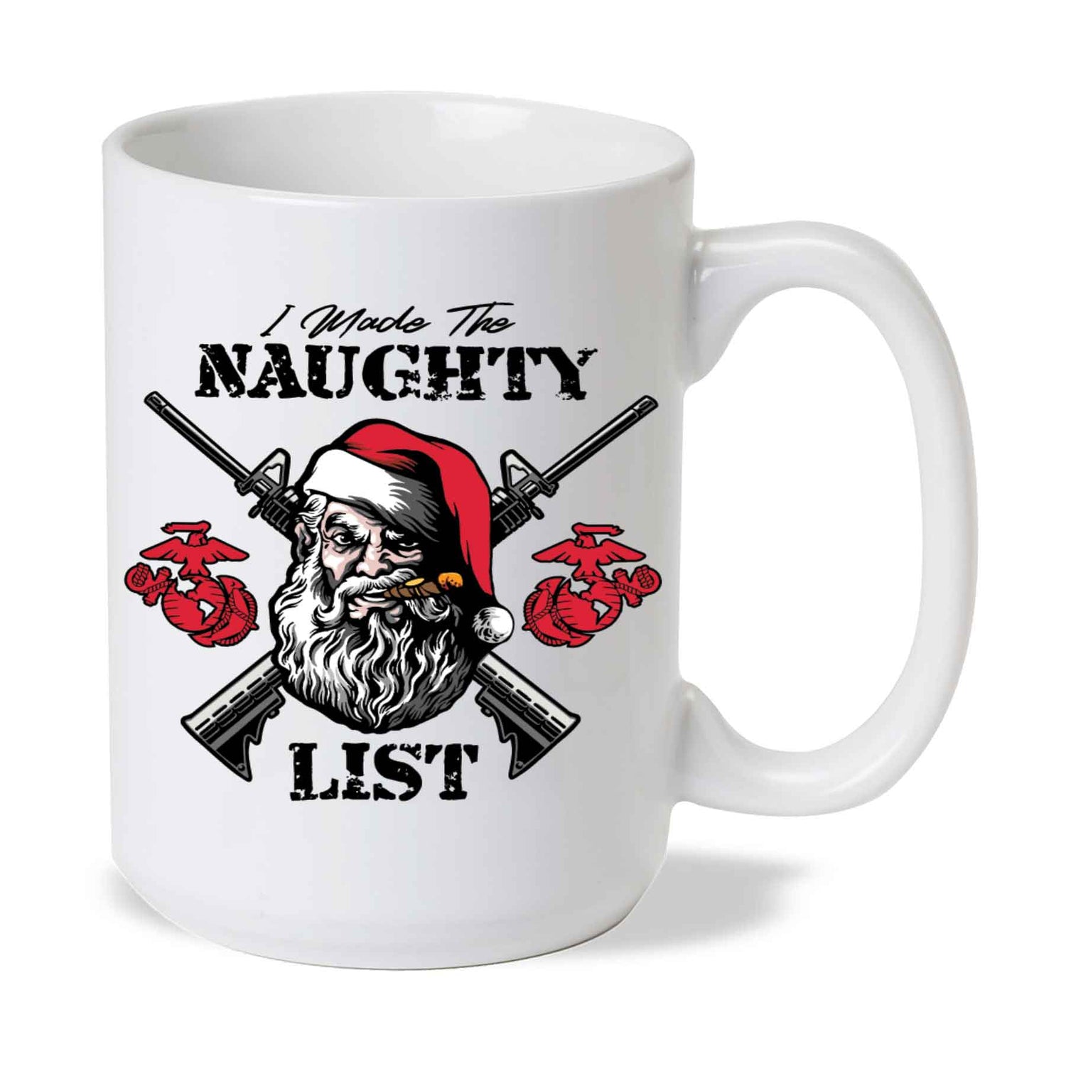 Embrace the holiday spirit with a twist using our unique "I Made The Naughty List" Christmas Mug. This isn't your average festive cup of cheer; it boasts a bold design featuring an irked Santa with two crossed rifles set assertively behind him, complemented by twin Eagle, Globe, and Anchor emblems. Underneath, the daring declaration "I made the naughty list" confirms your mischievous side is on full display.