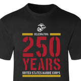 Celebrate Marine Corps history with the USMC Celebrating 250 Years T-Shirt in black. The design honors the 250th Birthday of the United States Marine Corps, featuring "Celebrating 250 Years," "United States Marine Corps," and the iconic Eagle, Globe, and Anchor emblem proudly displayed on the chest.