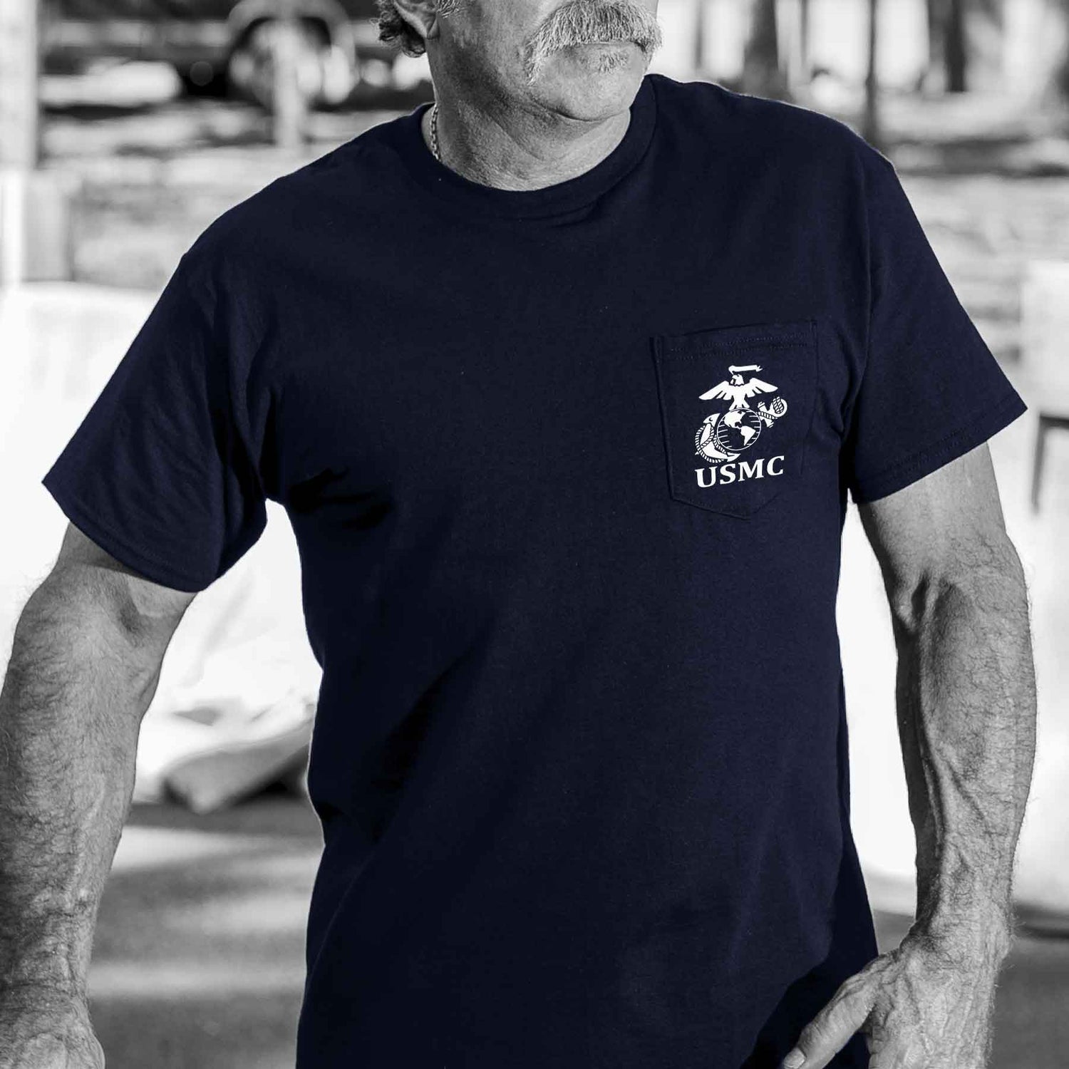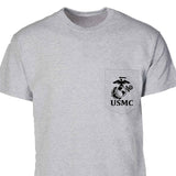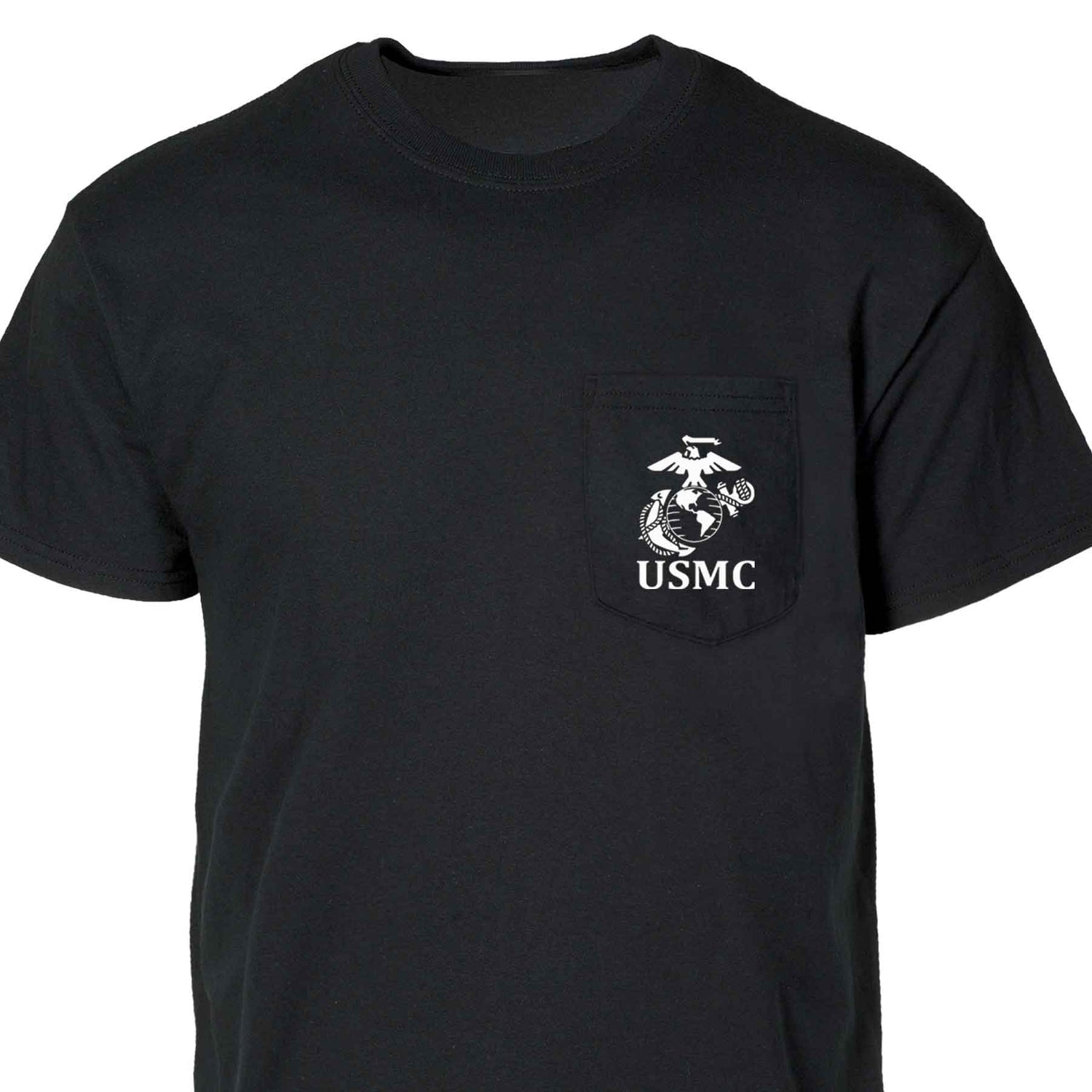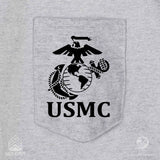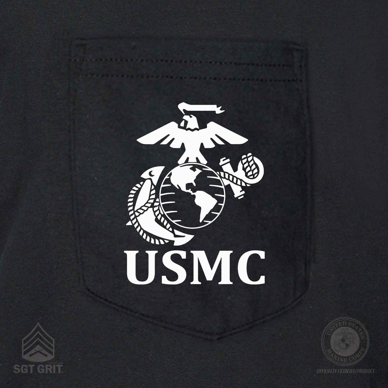 Our popular USMC pocket T-shirt with the Marines' EGA emblem from SGT GRIT is a SGT GRIT exclusive in your choice of three colors. The screen printed Eagle, Globe and Anchor emblem, plus the letters USMC, are positioned directly on the front left breast pocket of this crewneck Marine Corps tee with short sleeves.