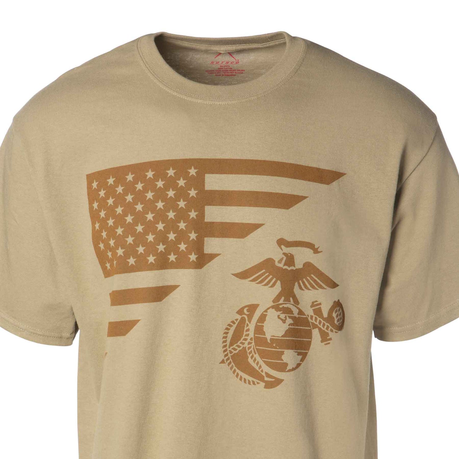Our two-tone Marine Corps U.S. flag and EGA emblem T-shirt from SGT GRIT is a contemporary color choice in brown on tan in 100% cotton. This combination U.S. flag/Eagle, Globe and Anchor emblem short-sleeve crewneck tee is available in sizes small to 3X. SGT GRIT is your source for officially licensed USMC products. Enjoy our everyday discount prices.
