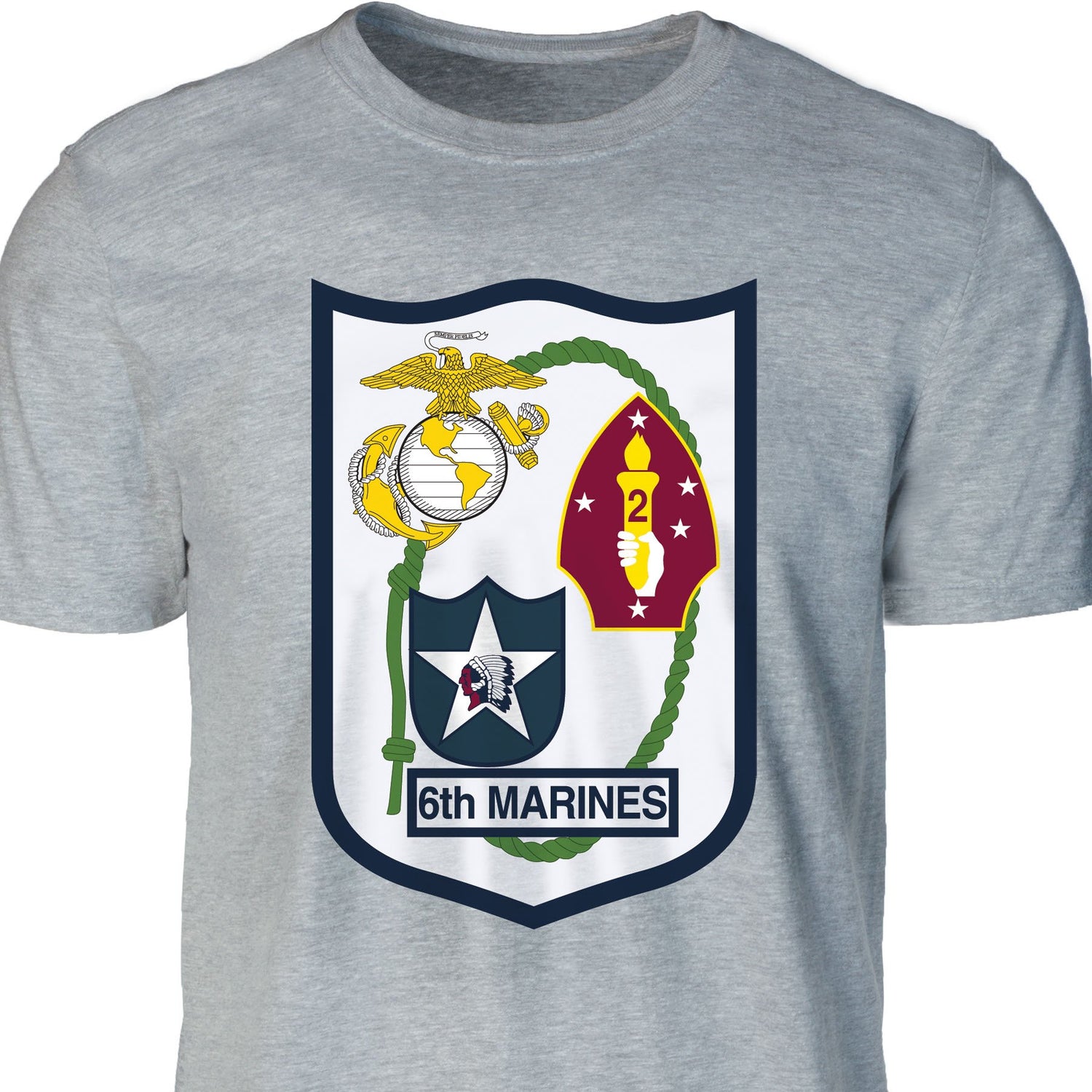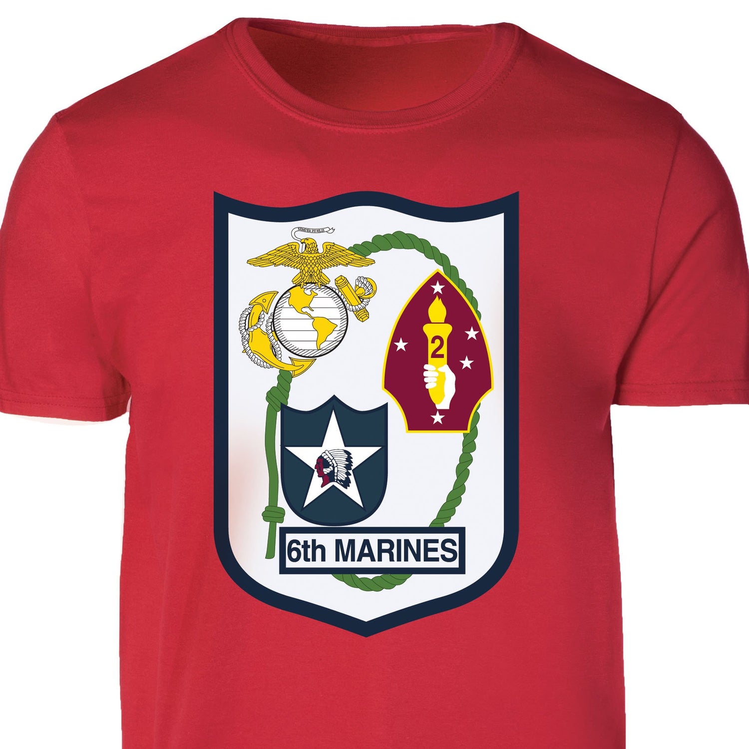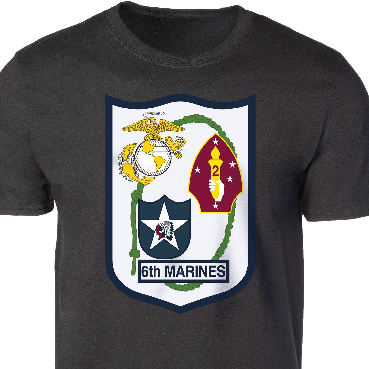 Your USMC collection won't truly be complete until you add this great T-shirt. This t-shirt features the 6th Marines Regimental Marines patch that can be personalized with your location and year.