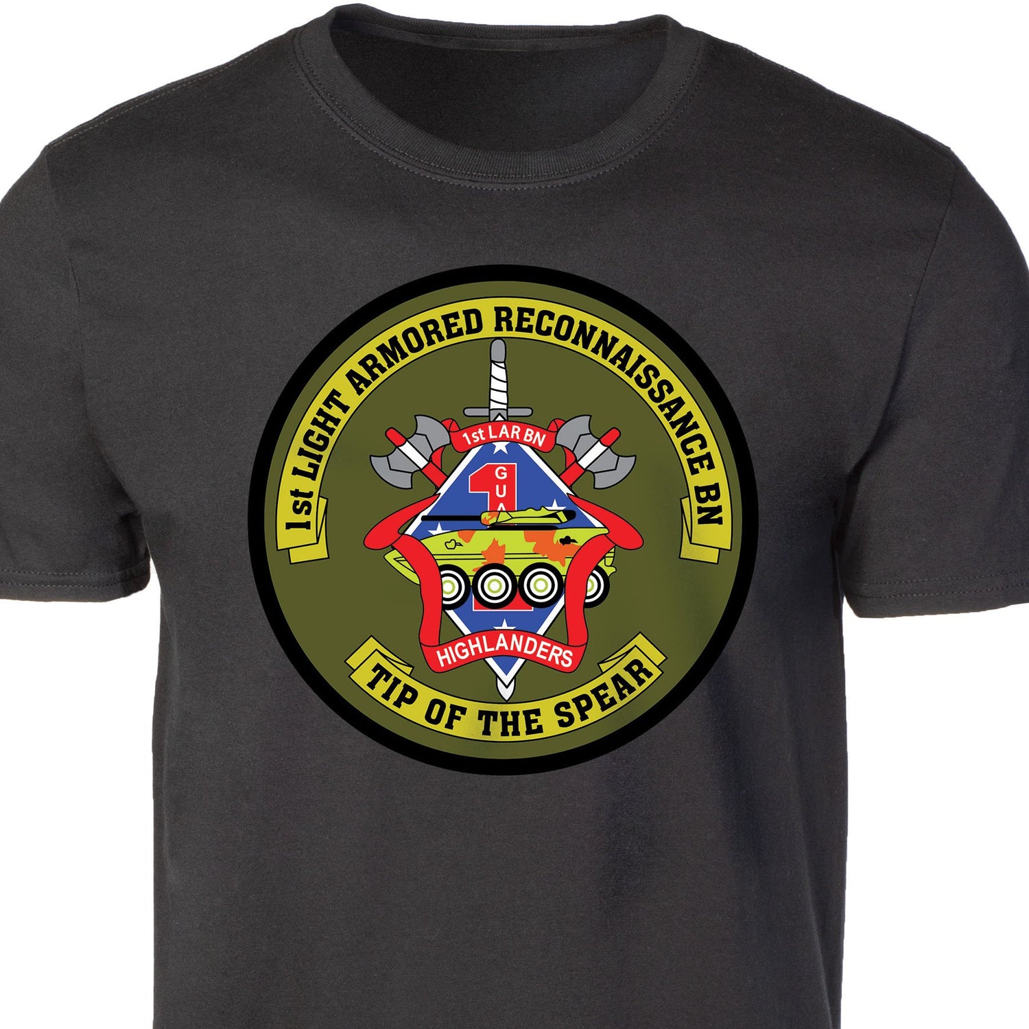 Your USMC collection won't truly be complete until you add this great T-shirt. This t-shirt features the 1st LAR Battalion patch that can be personalized with your location and year.