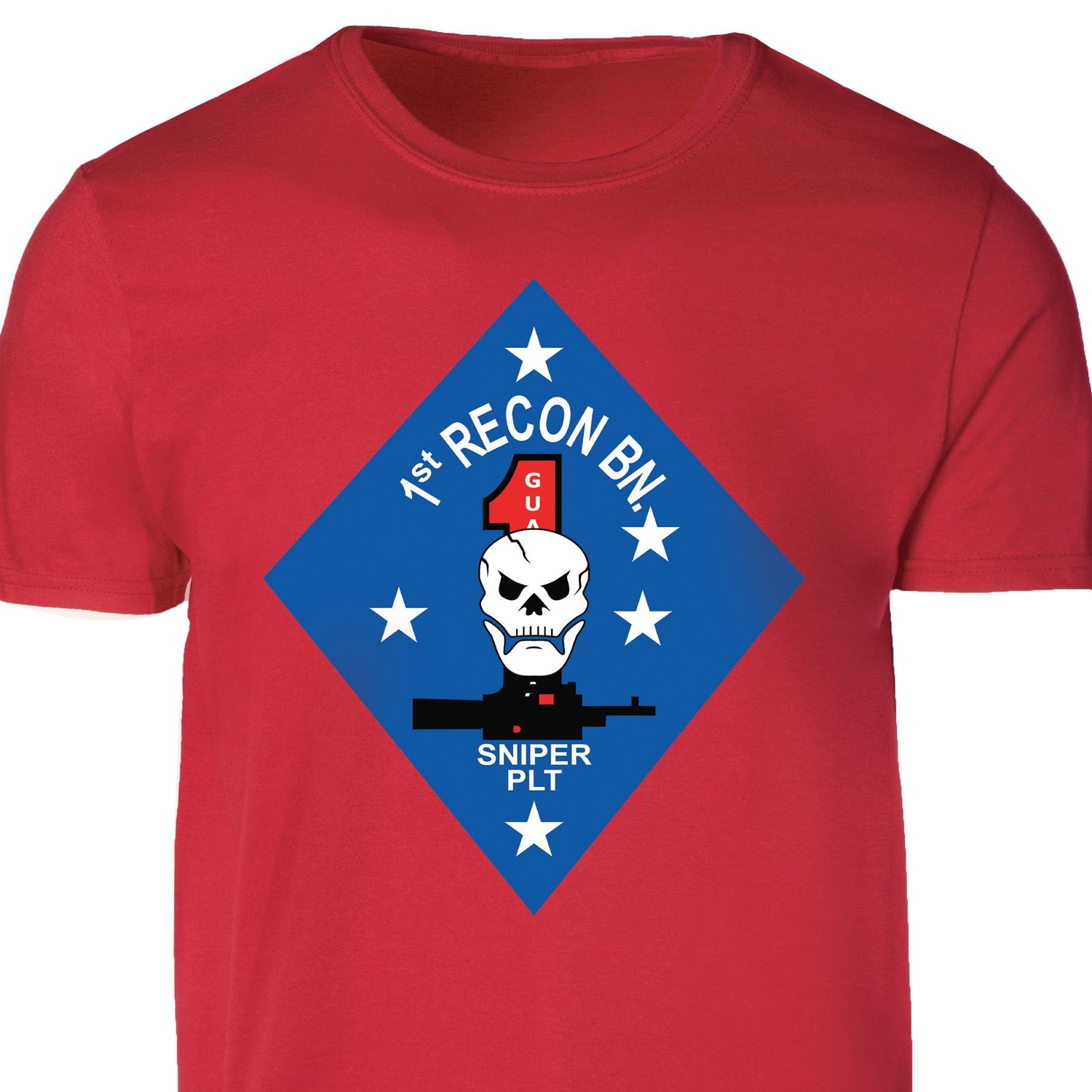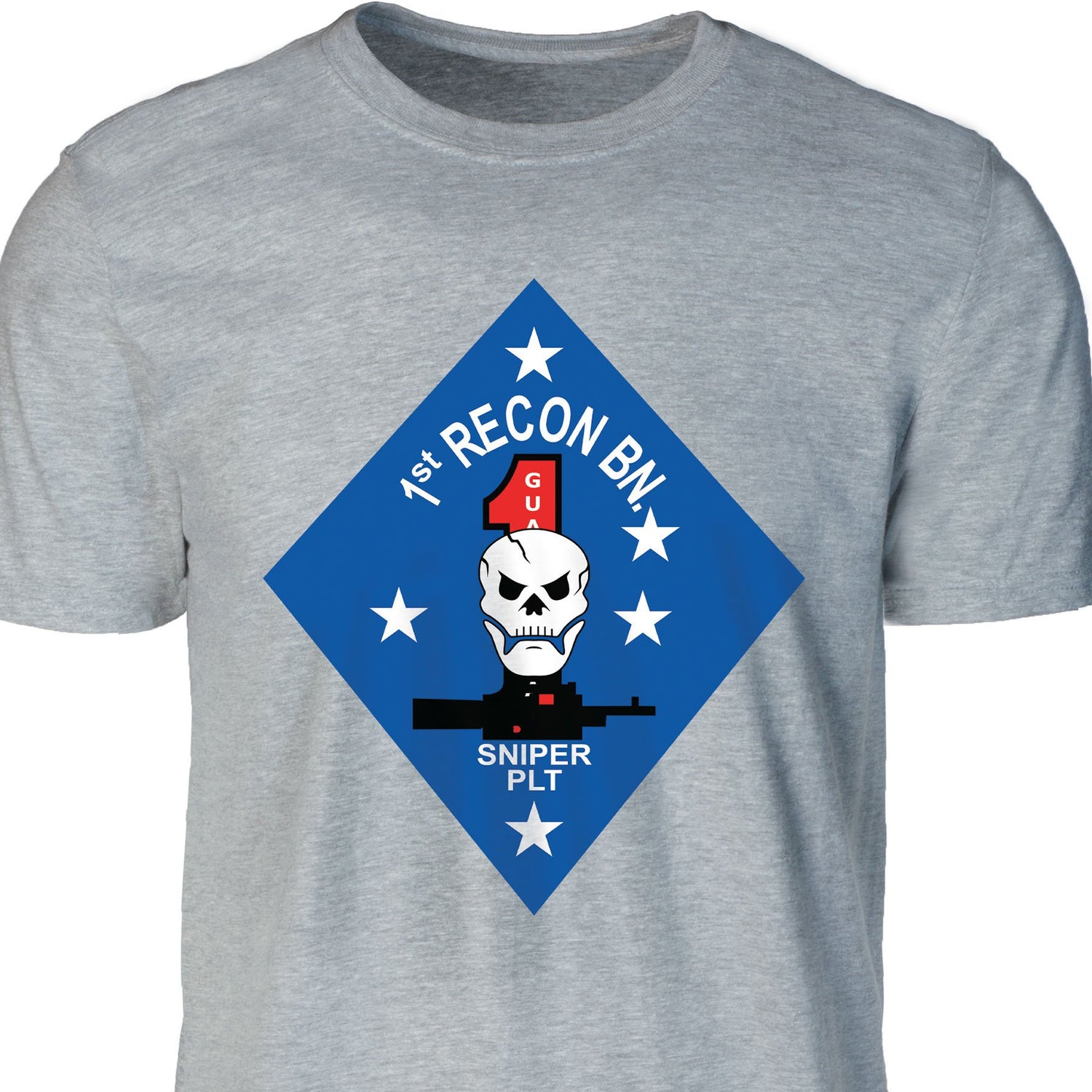 Your USMC collection won't truly be complete until you add this great T-shirt. This t-shirt features the 1st Recon Battalion Sniper Platoon patch that can be personalized with your location and year.