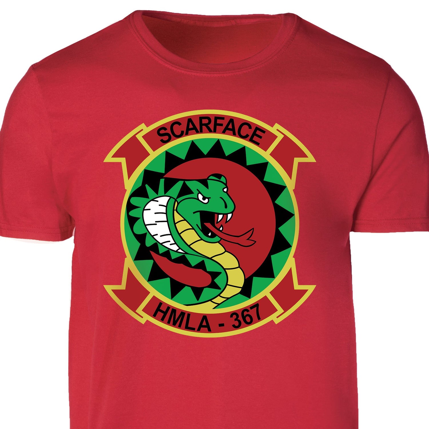 Your USMC collection won't truly be complete until you add this great T-shirt. This t-shirt features the HMLA-367 Scarface patch that can be personalized with your location and year.