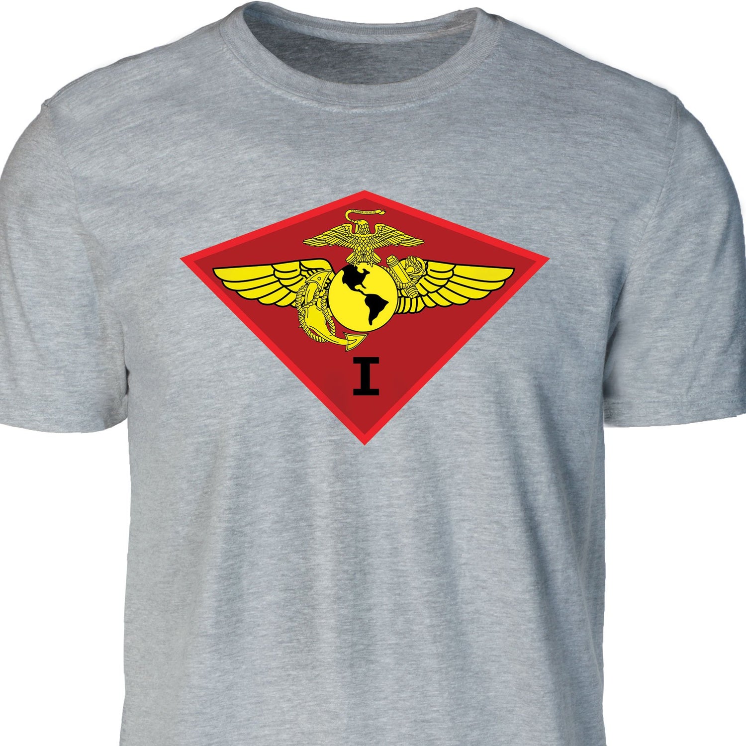 Your USMC collection won't truly be complete until you add this great T-shirt. This t-shirt features the 1st Marine Air Wing patch that can be personalized with your location and year.