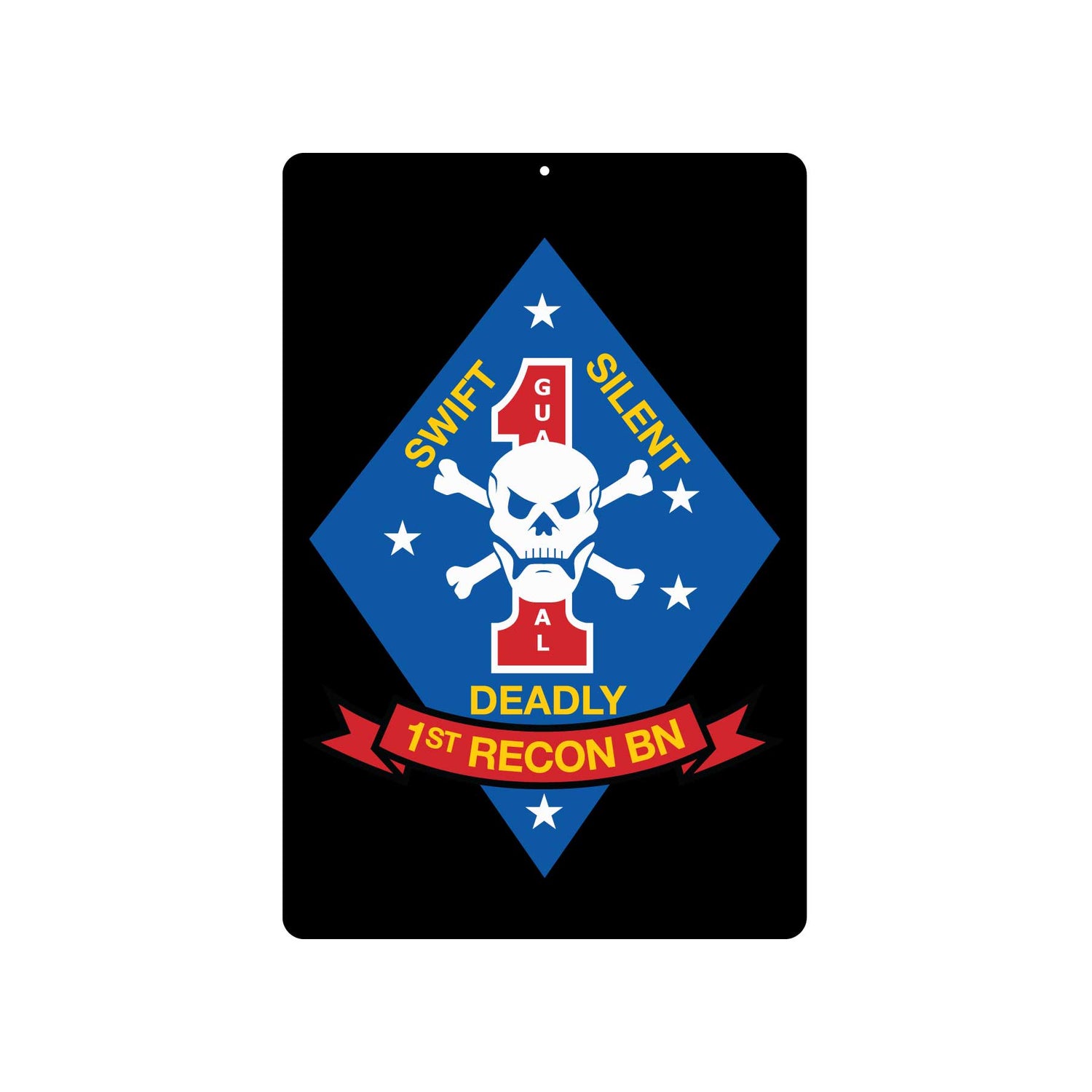 Swift, silent and deadly are the words displayed on our U.S. Marine Corps 1st Recon Battalion metal sign from SGT GRIT. Our colorful Marine Corps metal signs are crafted from aluminum, and they can be personalized with your name and conflict location. Each is approximately 12 inches by 18 inches in size.