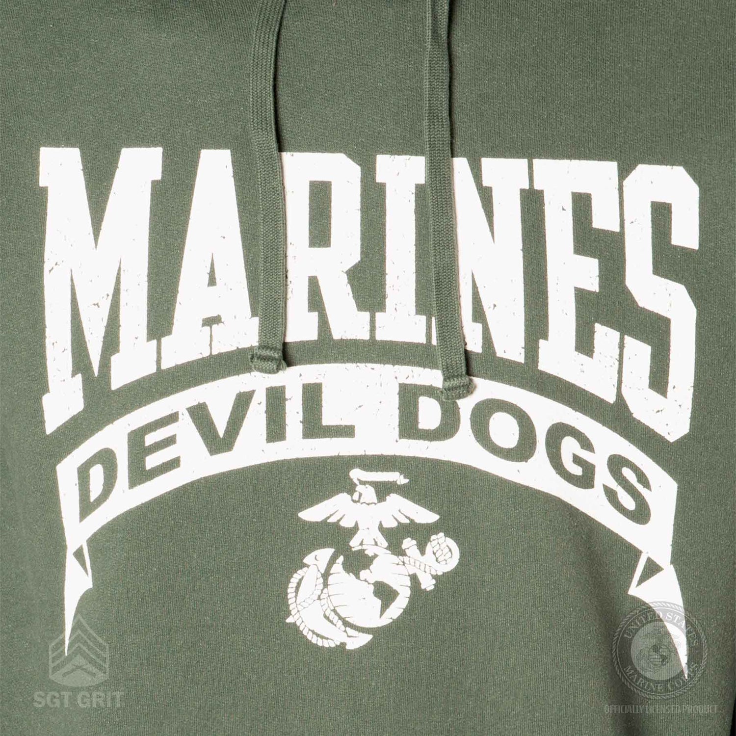 Stand tall in the ComfortWash Marines Devil Dogs Hoodie. Paying homage to "Marines" and "Devil Dogs" with the iconic Eagle, Globe, and Anchor emblem, this hoodie is the embodiment of Marine pride. Made with a super soft vintage wash and a blend of 80% USA grown cotton/ 20% polyester, it provides no-shrink comfort wash after wash. This hoodie features ribbed cuffs and waistband, a twill drawcord, and a jersey lined hood. The double-needle cover-seamed neck with flat lay collar retains its shape, and the shoulder-to-shoulder tape adds to its durability. Display your commitment with this essential hoodie.