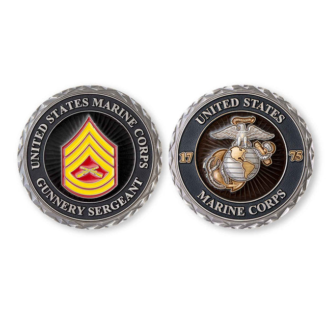Embrace your military pride with our USMC Gunnery Sergeant Rank Challenge Coin. Crafted from robust zinc, it boasts a striking 1¾" diameter design. One side boldly features the iconic Eagle, Globe, and Anchor emblem, flanked by the phrases "United States Marine Corps" and "1775," paying homage to its storied history. The reverse side proudly displays the Gunnery Sergeant rank insignia, symbolizing leadership and valor. This coin is more than a keepsake, it's a salute to your Marine Corps commitment and a tangible recognition of rank. Make it a standout addition to your collection today.