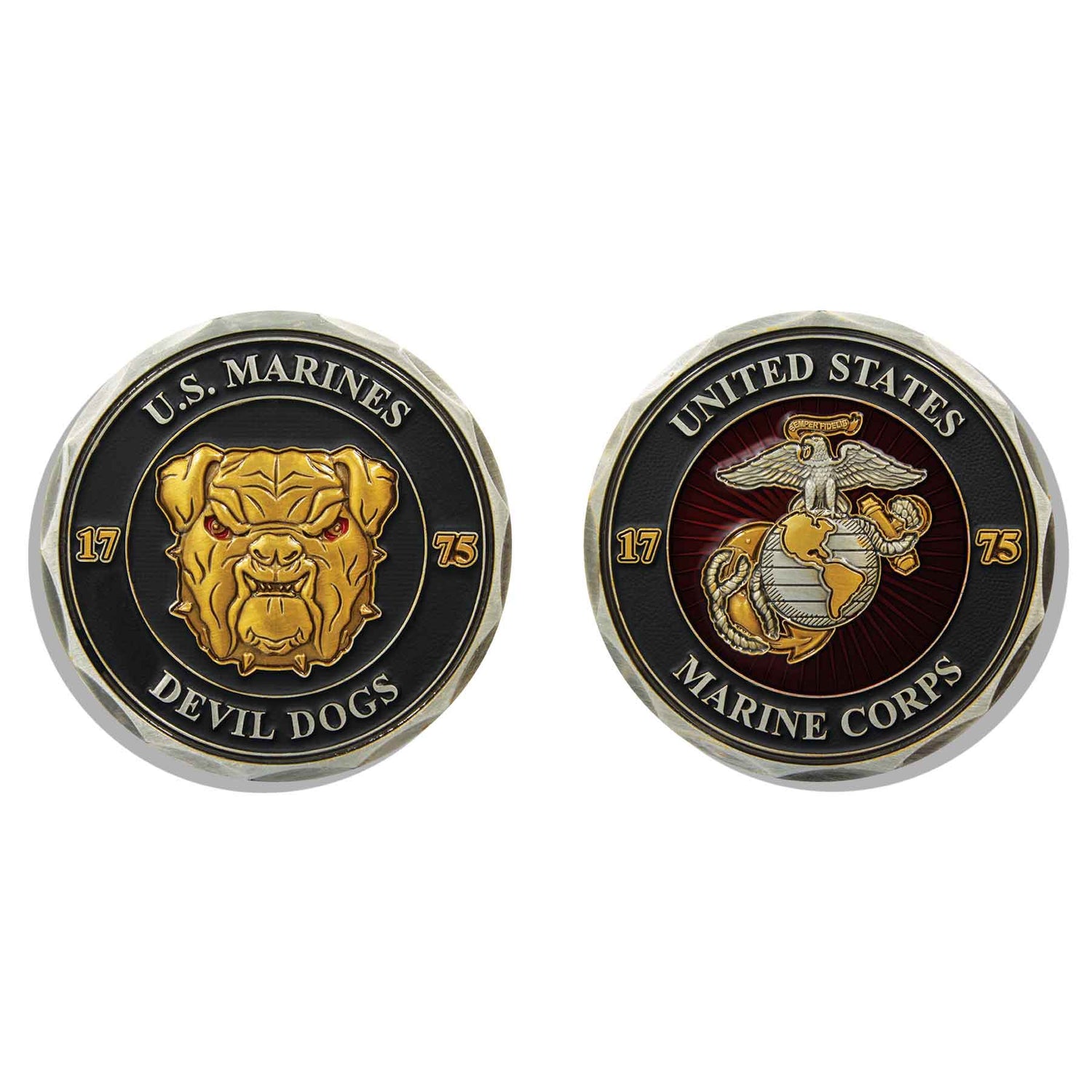 One side of the coin features the iconic Marine Corps bulldog, a symbol of strength, courage, and tenacity. Alongside the bulldog are the words "U.S. Marines" and "1775," which commemorate the founding of the Marine Corps and the unwavering dedication of its members.