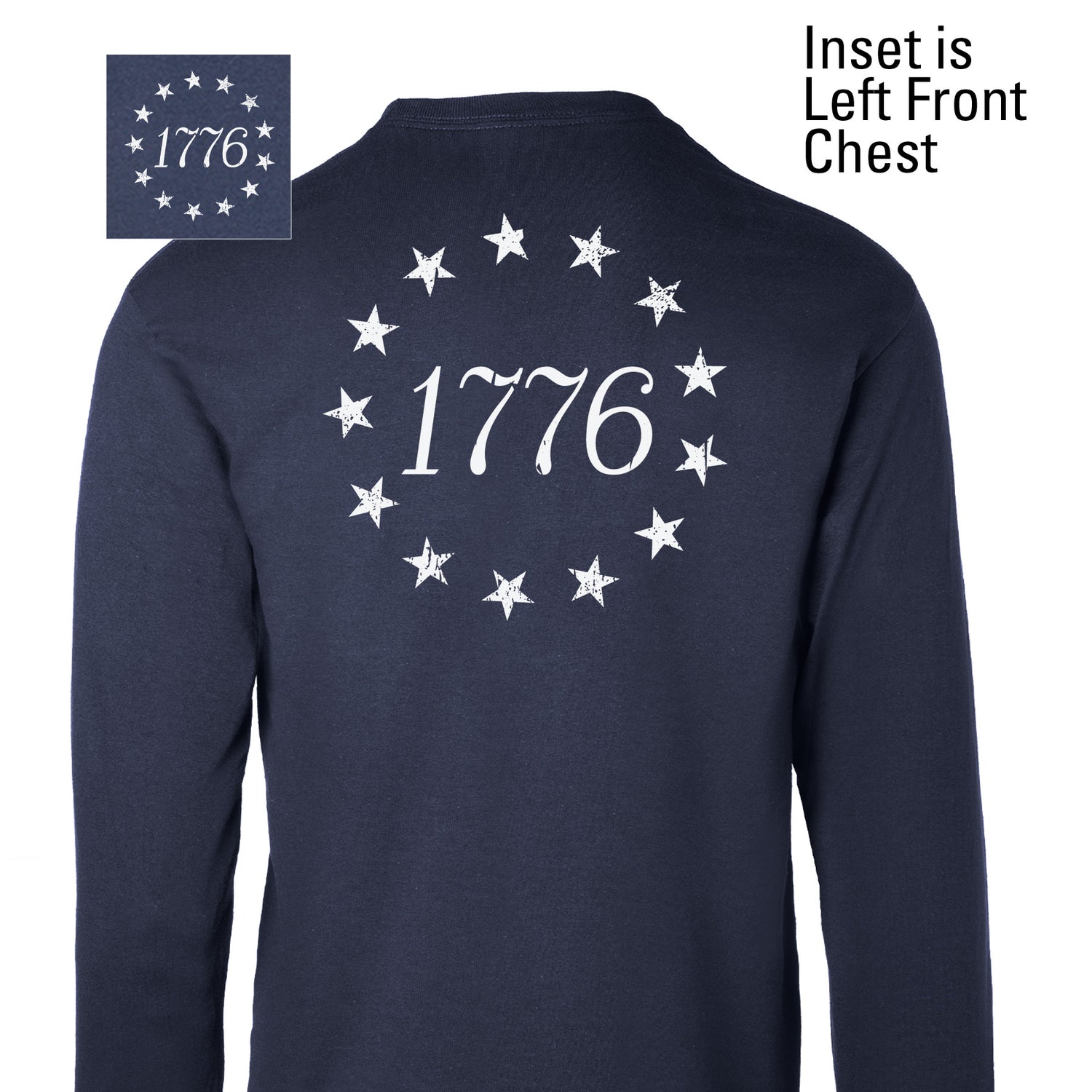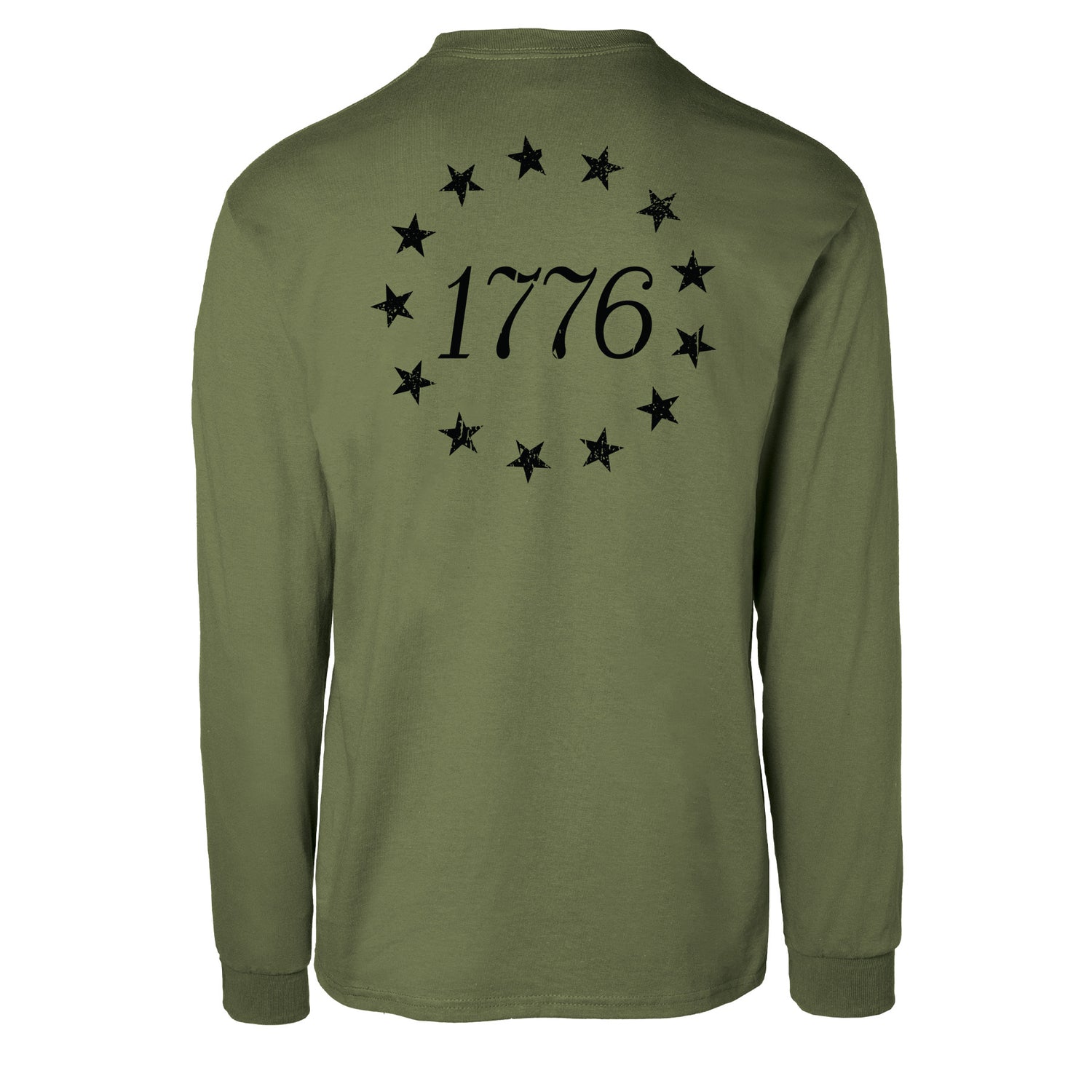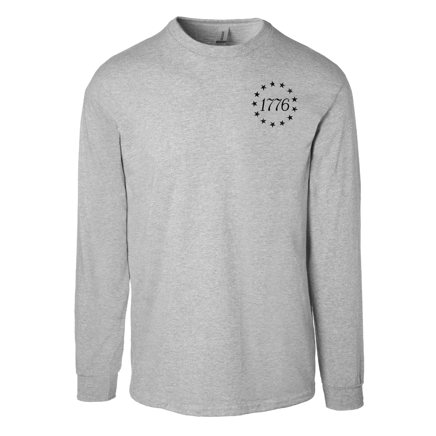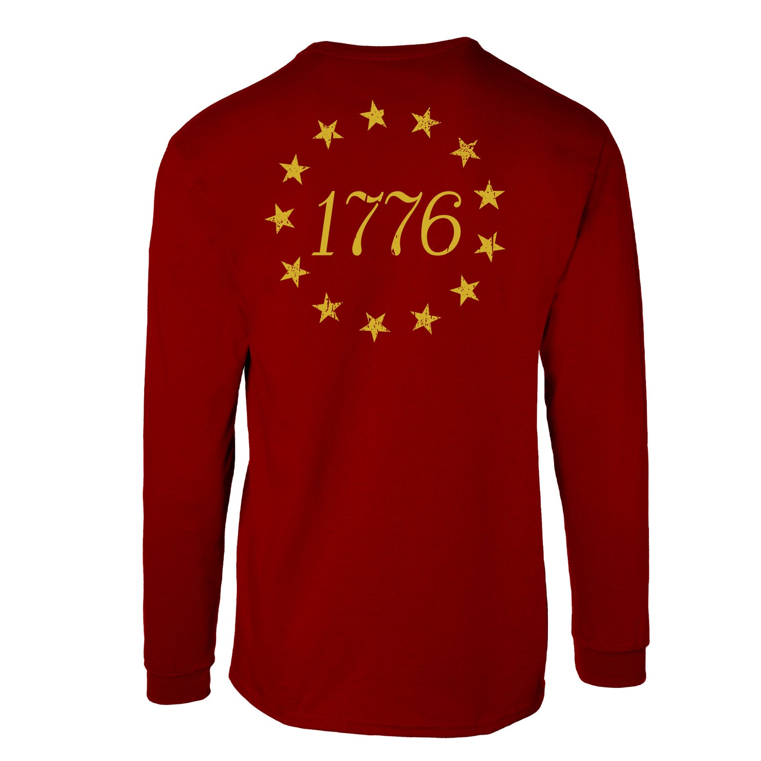 The 1776 Betsy Ross Flag Long Sleeve T-Shirt - Back Design is a bold tribute to the founding of the United States of America. This patriotic design features the iconic 13 stars of the Betsy Ross flag encircling “1776,” creating a powerful visual that honors American history and the birth of a nation. Timeless and symbolic, it’s the perfect way to celebrate freedom and 250 years of this great nation.