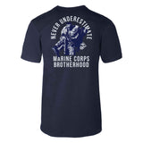A uniformed Marine carrying another Marine to safety is the center graphic on our USMC Marine Corps Brotherhood T-shirt from SGT GRIT. The navy blue T-shirt has graphic designs on the front and back of this 100% cotton tee. The back graphic with soldier carrying soldier includes the words: Never Underestimate. Marine Corps Brotherhood." The Marine Corps' EGA emblem is in back and over the left chest in front.