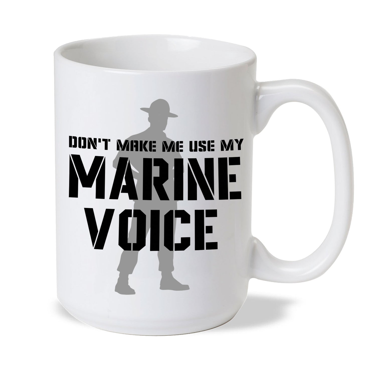 Start your day with a bold statement using the Marine Voice Mug. This distinctive mug features the iconic Eagle, Globe, and Anchor emblem of the United States Marine Corps, coupled with the assertive phrase "Don't make me use my Marine voice." It's a perfect way to show your Marine Corps pride or to gift to a beloved Marine in your life.