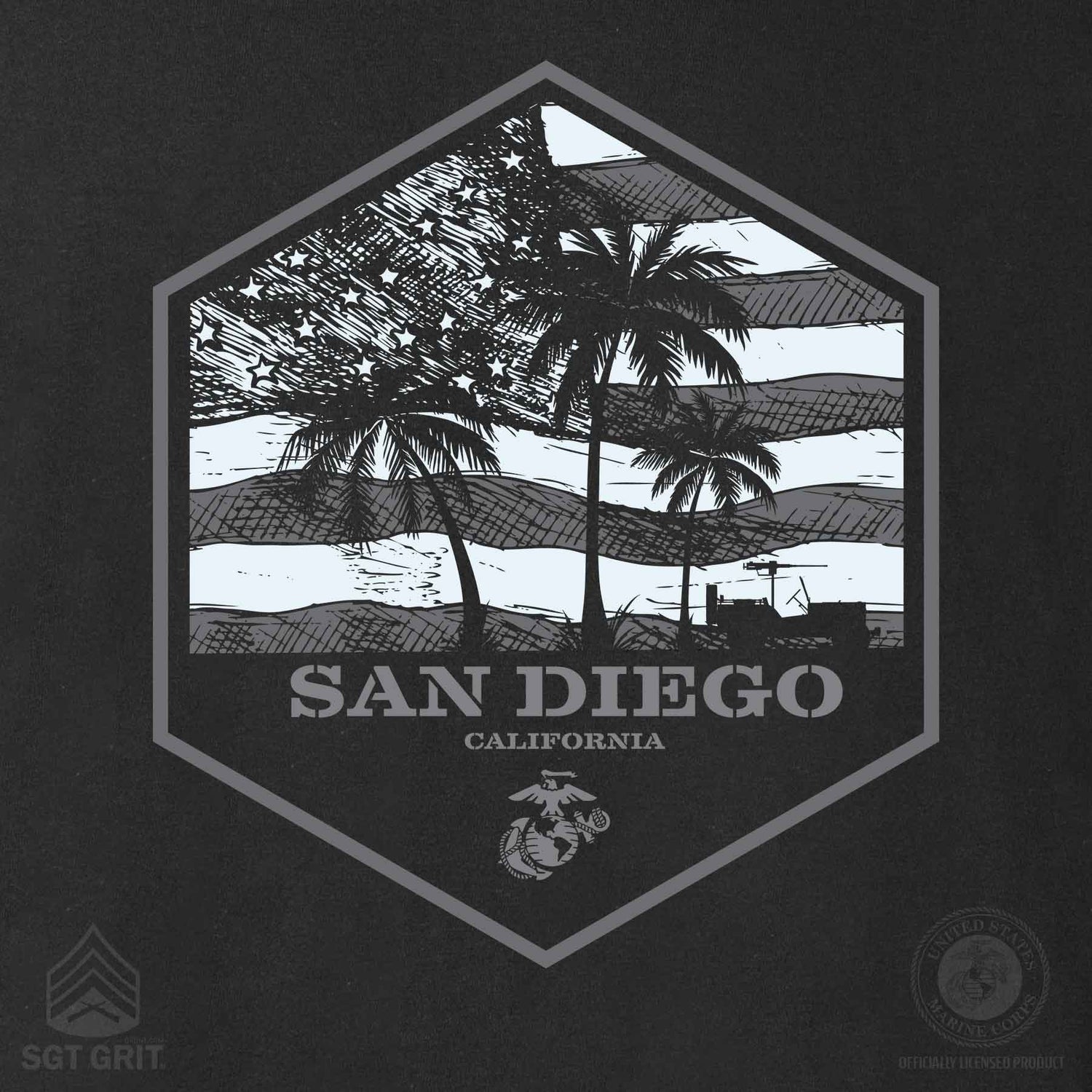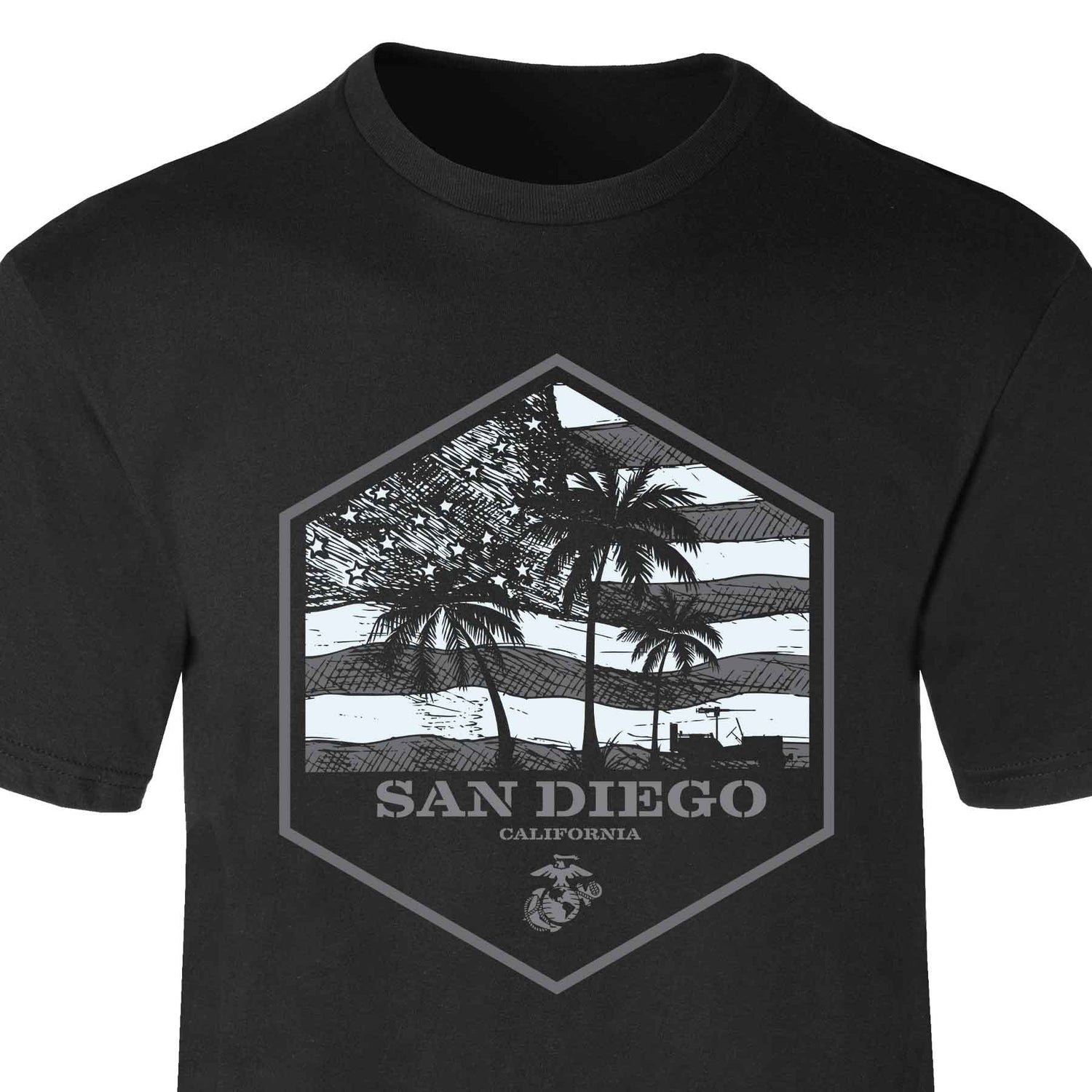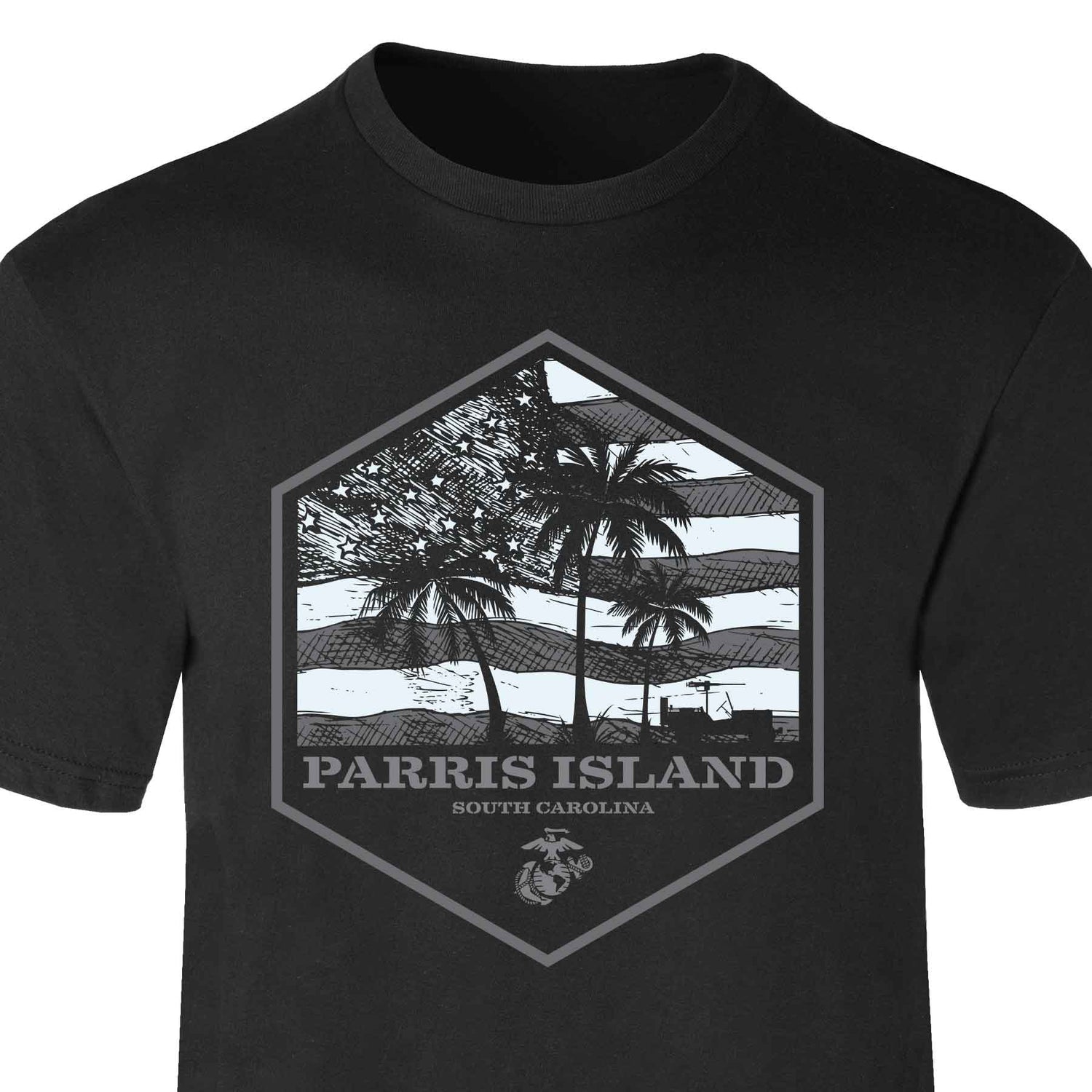 The USMC Bootcamp Hexagon T-Shirt – Black honors where every Marine is made. Featuring a bold hexagon design with palm trees and an American flag, this shirt proudly represents your training roots with your choice of “Parris Island” or “San Diego.” It’s a clean, modern take on Marine Corps pride that speaks to the grit, discipline, and brotherhood forged at boot camp.
