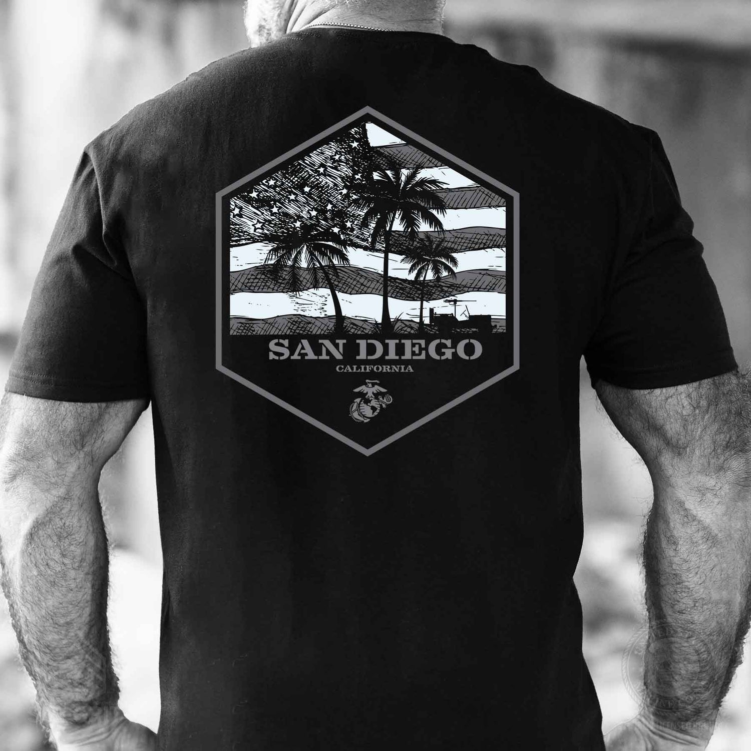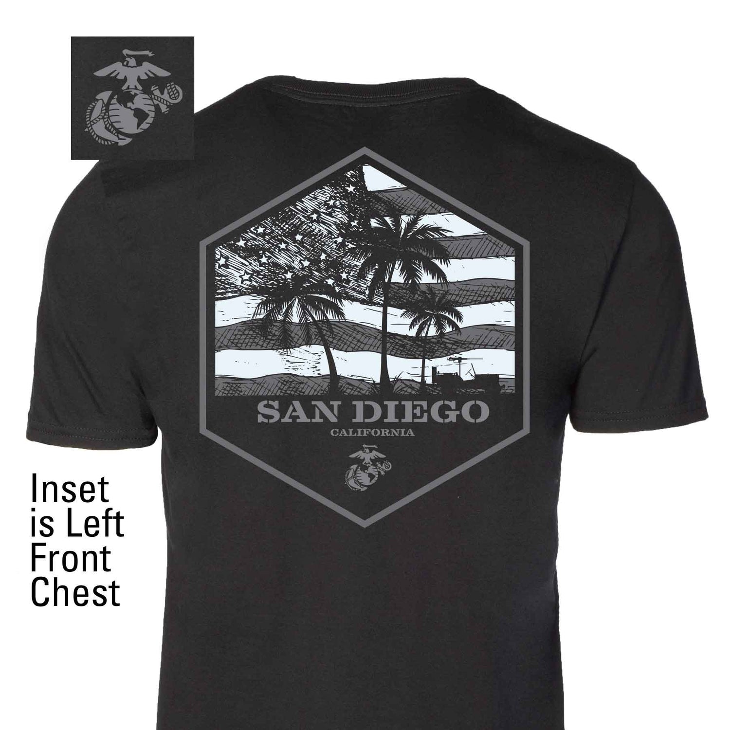 The USMC Bootcamp Hexagon Back Design T-Shirt – Black honors where every Marine is made. Featuring a bold hexagon design with palm trees and an American flag, this shirt proudly represents your training roots with your choice of “Parris Island” or “San Diego.” The iconic Eagle, Globe, and Anchor emblem is displauyed on the ledft chest. It’s a clean, modern take on Marine Corps pride that speaks to the grit, discipline, and brotherhood forged at boot camp.
