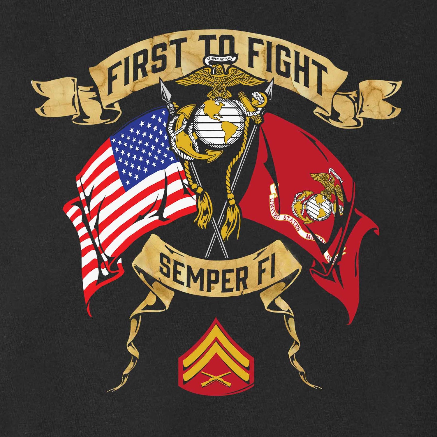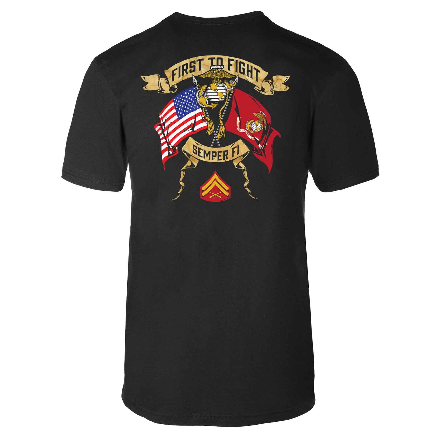 Proudly represent your Marine Corps service with the Choose Your Rank USMC and USA Crossed Flags T-shirt. The back design features "First to Fight," crossed USMC and American flags, the iconic Eagle, Globe, and Anchor emblem, and your personalized choice of rank insignia. Your rank is also displayed on the left chest, making this T-shirt a unique and meaningful tribute to your service. Made from 100% premium cotton, it offers a soft, breathable feel for all-day comfort. Perfect for Marine Corps events, casual wear, or as a thoughtful gift, this T-shirt allows you to showcase your pride in both the Corps and the country.