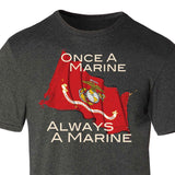 Let them know that, even when you're not wearing a uniform, you're still a Marine when you wear our "Once a Marine, Always a Marine" casual cotton poly T-shirt from SGT GRIT. The front of the shirt screen printing on this charcoal gray short-sleeve USMC T-shirt is a red Marine Corps flag with an EGA emblem at the center. The fabric blend on this SGT GRIT Exclusive T-shirt is 35% cotton and 65% polyester for a comfortable fit that holds its shape.