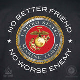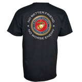 Show your Marine pride with this No Better Friend Front Pocket with Full Back T-shirt. This shirt features the United States Marine Corps seal that reads "No Better Friend No Worse Enemy".