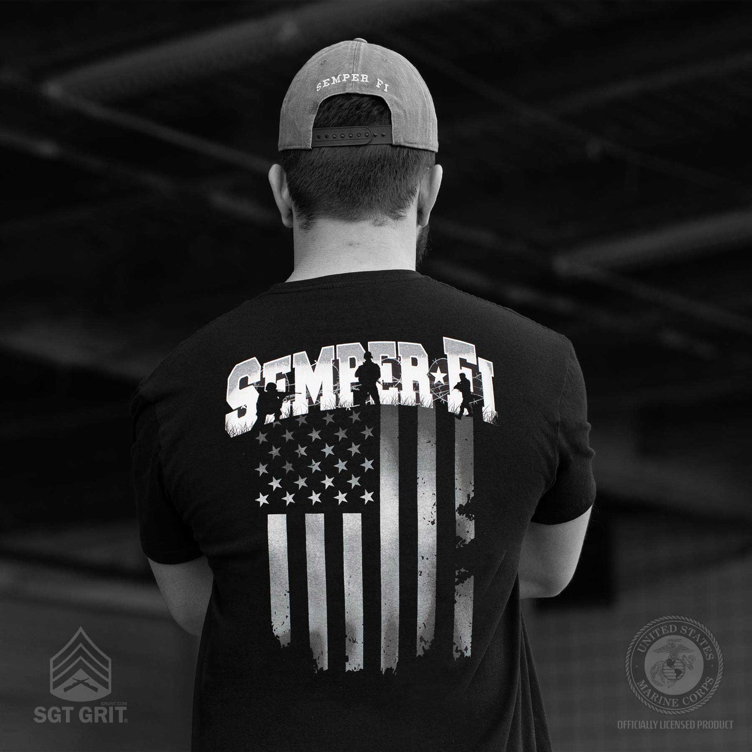Three combat-ready U.S. Marines stand in silhouette in front of the words Semper Fi on our distressed-style graphic black and white Marine Corps Semper Fit Flag T-shirt from SGT GRIT with front and back designs. The U.S. flag hangs vertically below the words on this design on the back of the USMC tee. The graphics and words are in white.
