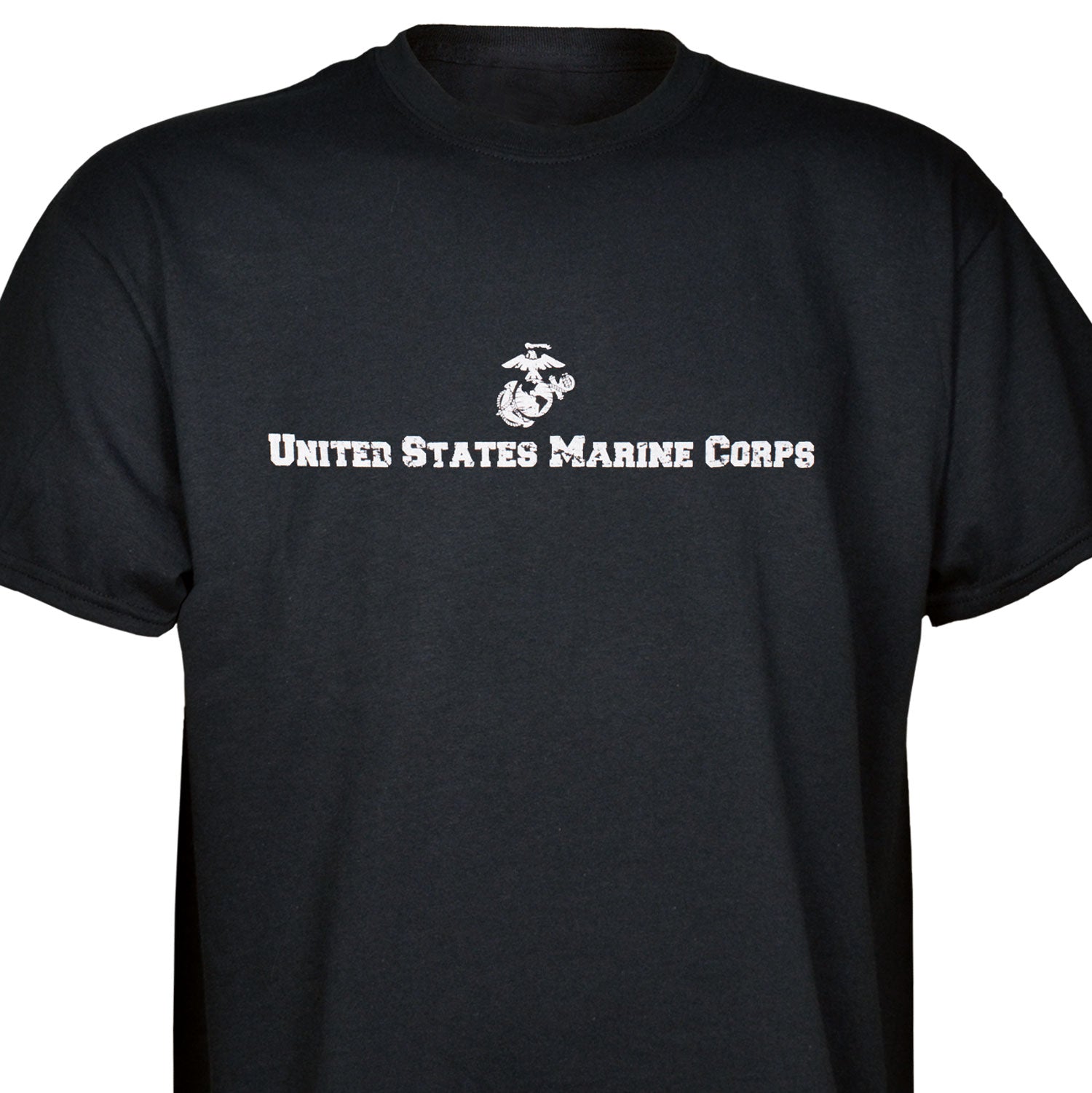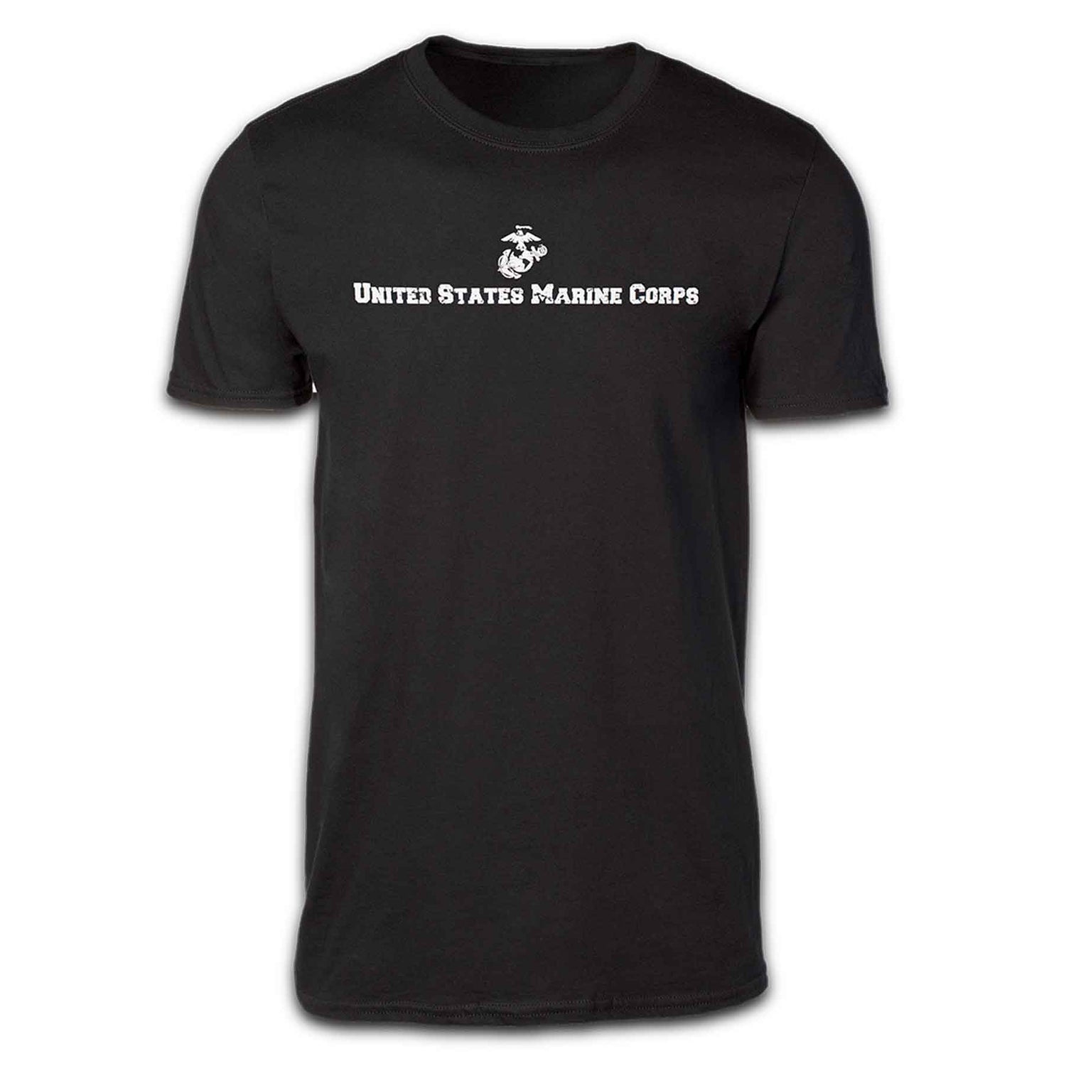 On the front of the 100% cotton black T-shirt are the Marine Corps EGA emblem and the words United States Marine Corps. The emblem and words are white on black on this short-sleeve crewneck USMC T-shirt in adult sizes.