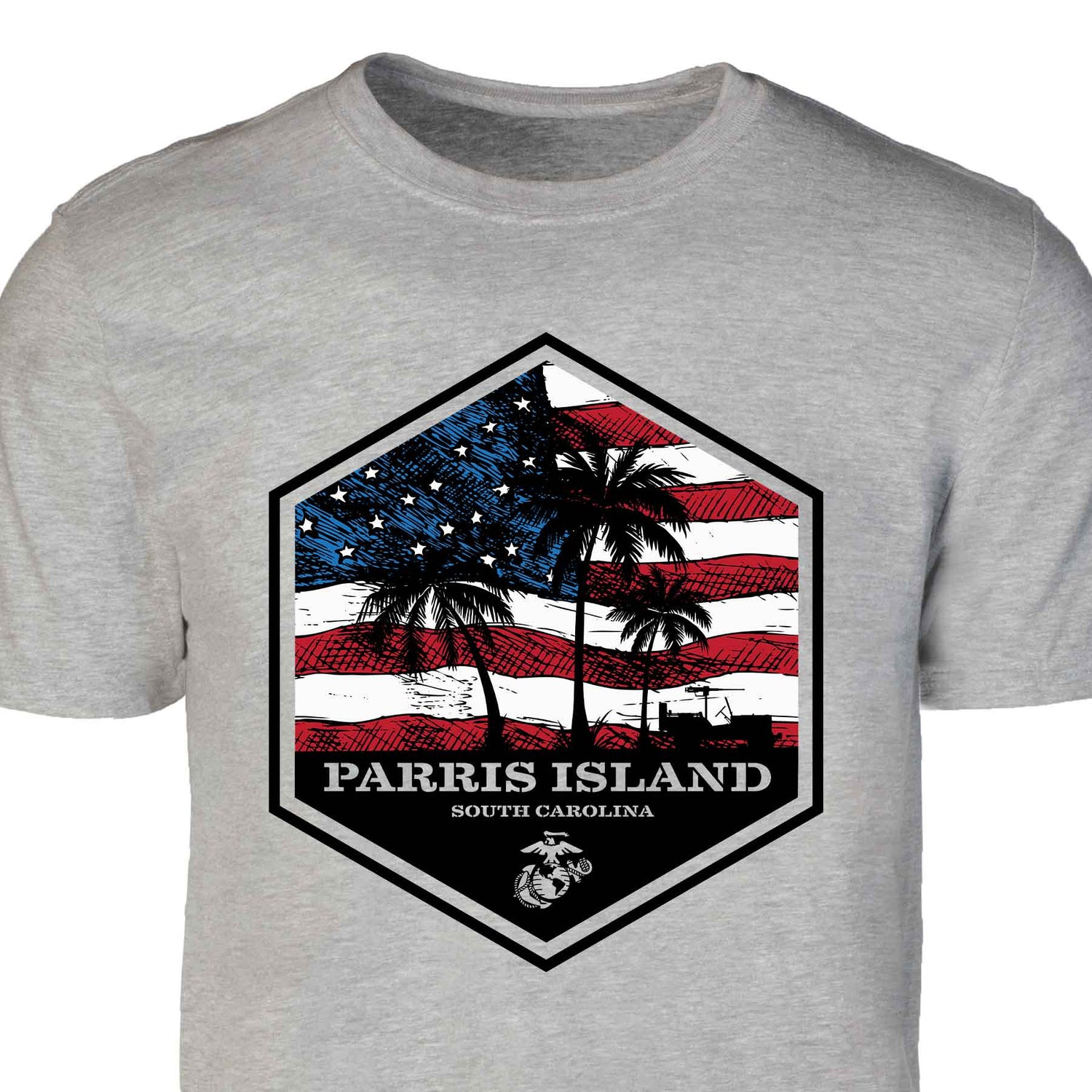 The USMC Bootcamp Hexagon T-Shirt – Grey honors where every Marine is made. Featuring a bold hexagon design with palm trees and an American flag, this shirt proudly represents your training roots with your choice of “Parris Island” or “San Diego.” It’s a clean, modern take on Marine Corps pride that speaks to the grit, discipline, and brotherhood forged at boot camp.