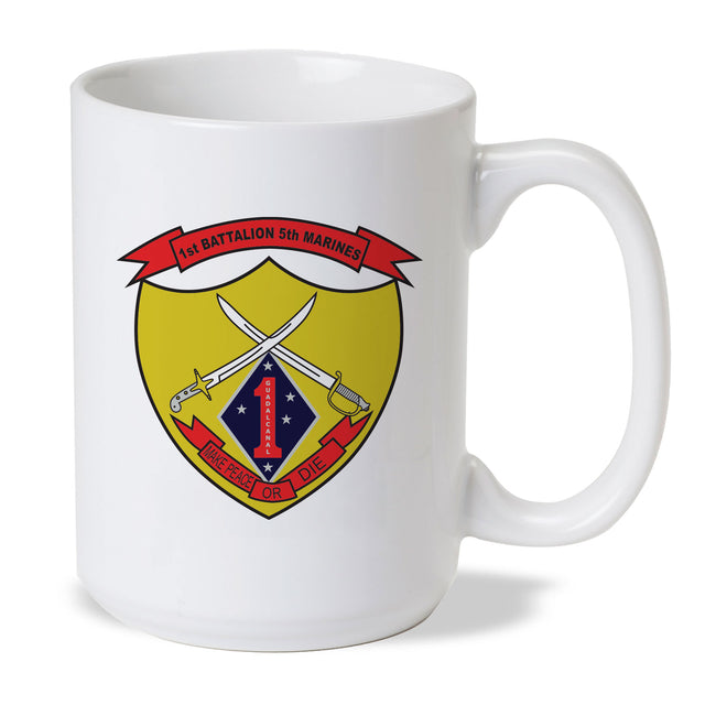 White coffee cup featuring the 1st Battalion 5th Marines patch.