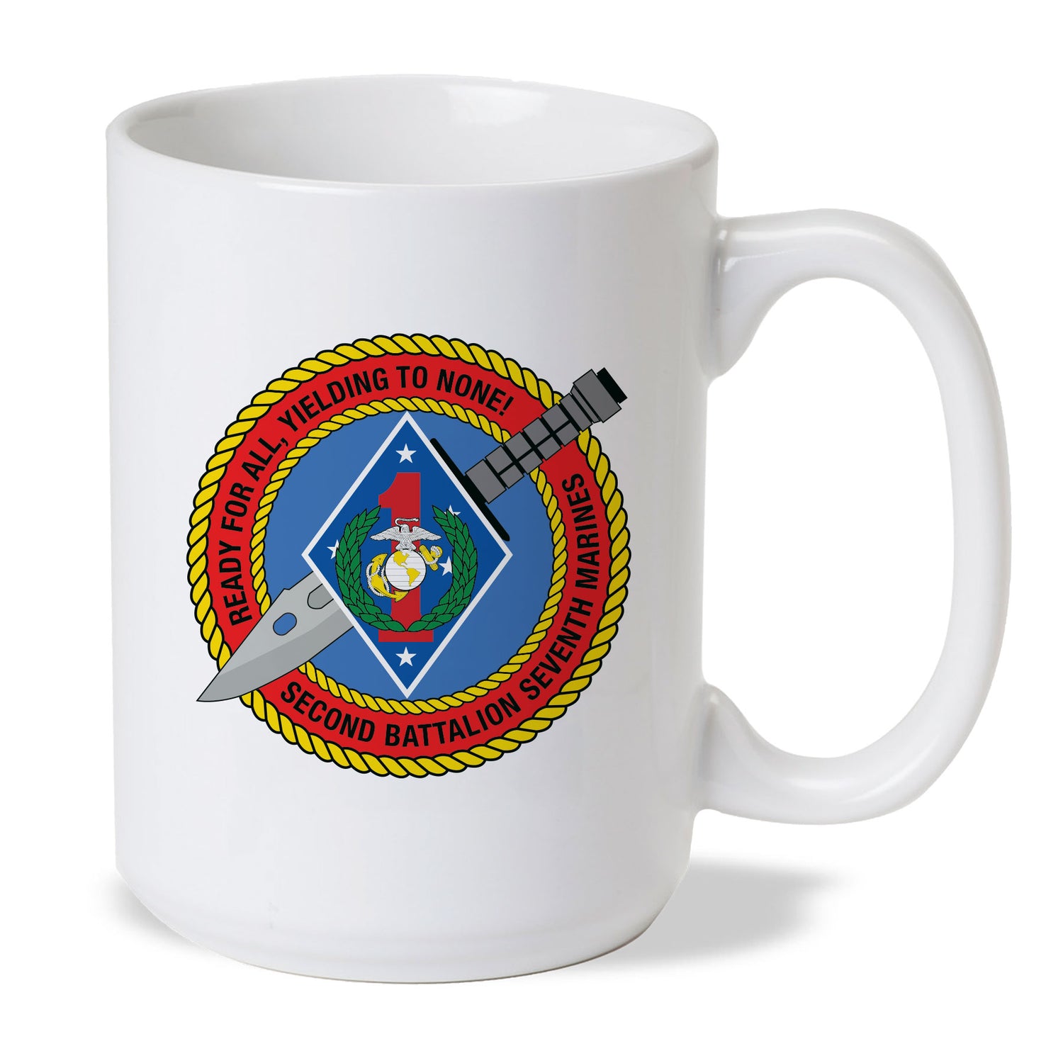 White coffee cup featuring the 2nd Battalion 7th Marines patch.