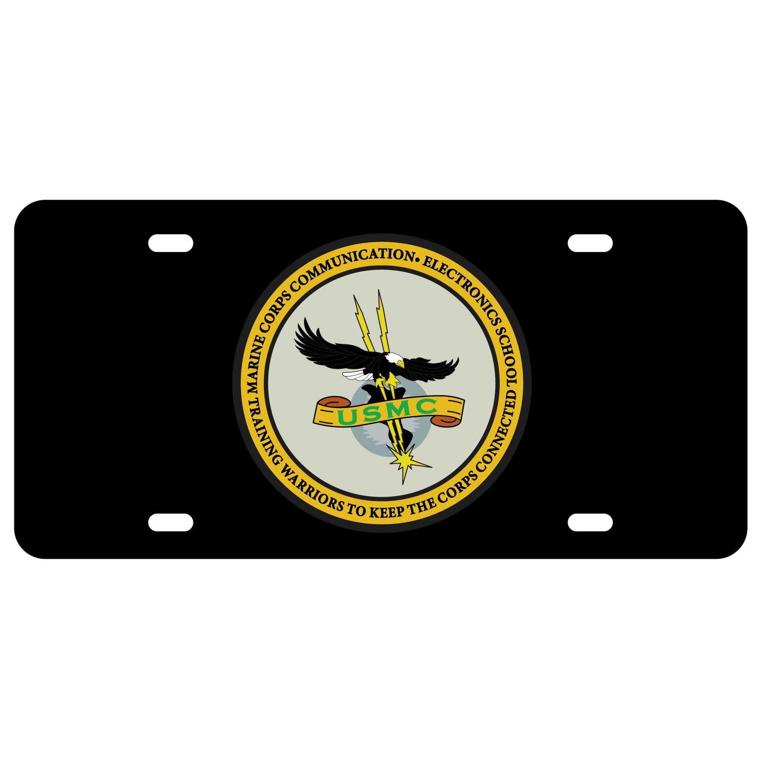 License plate featuring the MCCES (Marine Corps Communications Electronics School) patch art.