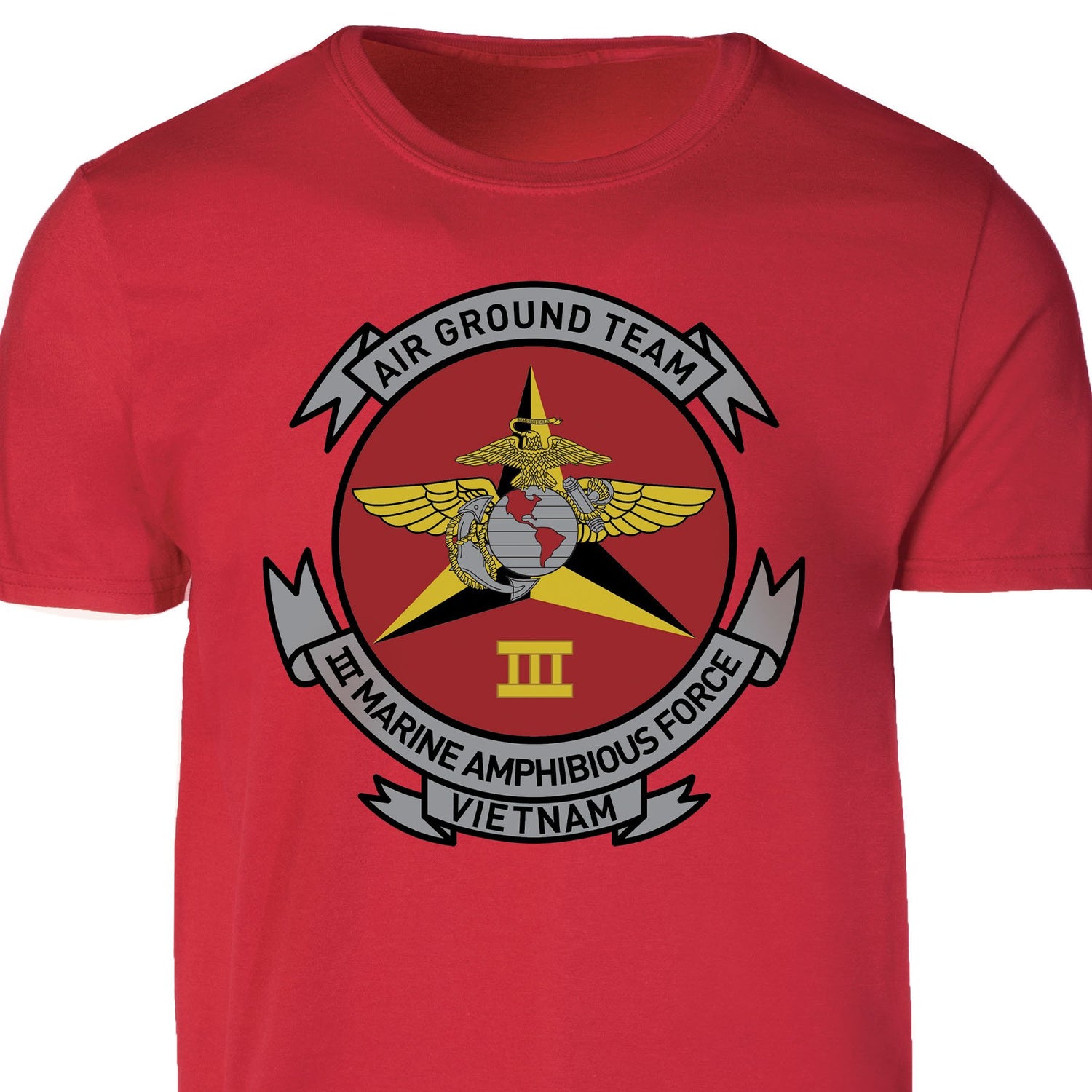 Your USMC collection won't truly be complete until you add this great T-shirt. This t-shirt features the III MAF Air Ground Team Vietnam patch that can be personalized with your location and year.