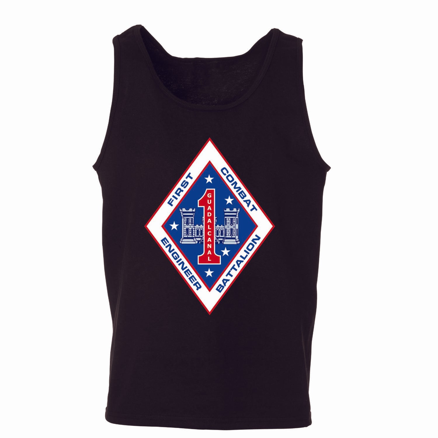 Your USMC collection won't truly be complete until you add this great Tank Top. This shirt features the 1st Combat Engineer Battalion patch and can be personalized with your location and year.
