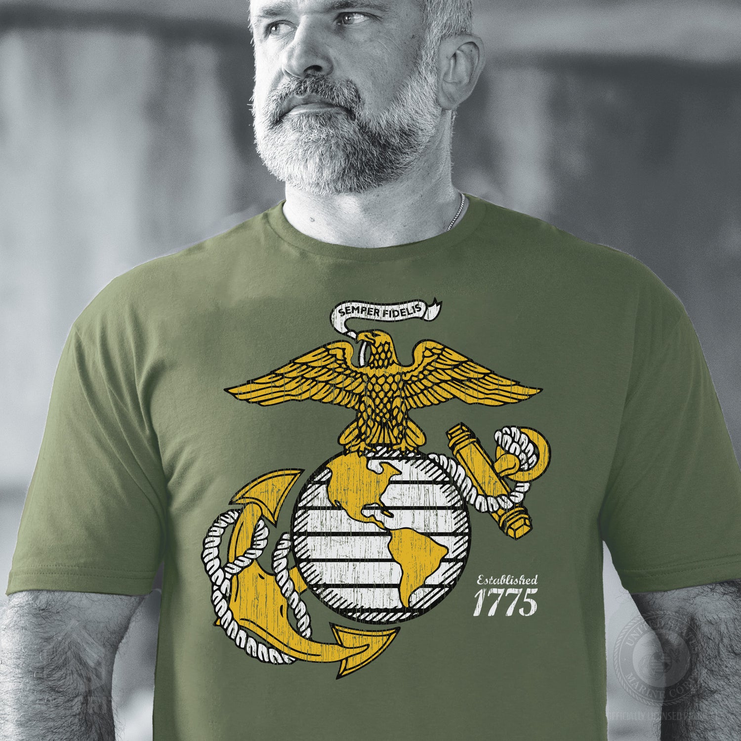 Show your Marine Corps pride in standout style with the Gold Eagle, Globe, and Anchor T-Shirt from SGT GRIT. This officially licensed United States Marine Corps tee features the iconic Eagle, Globe, and Anchor emblem in bold white and gold, making a powerful statement that honors the strength, tradition, and legacy of the USMC.