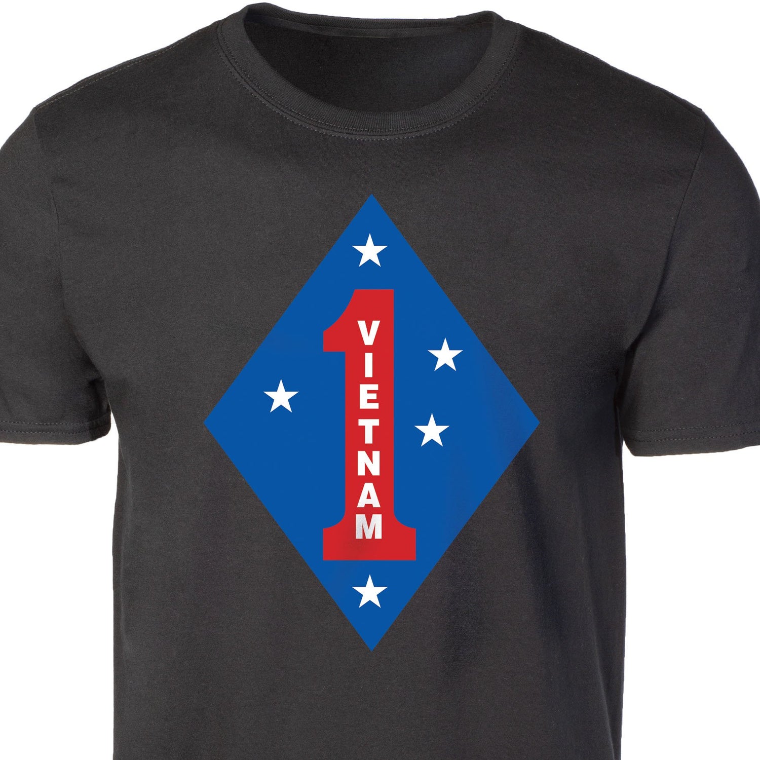 Your USMC collection won't truly be complete until you add this great T-shirt. This t-shirt features the Vietnam - 1st Marine Division Marines patch that can be personalized with your location and year.