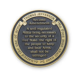 Celebrate your patriotism with our 2nd Amendment Challenge Coin. Masterfully crafted from durable zinc, it features a distinctive 1¾" diameter design. One side prominently showcases the United States of America Constitution alongside a detailed image of a rifle. The reverse reveals the complete 2nd Amendment inscribed, coupled with a powerful quote from Thomas Jefferson. This token is more than a mere collectible, it's a testament to your unwavering commitment to our cherished rights. Your constitution and Second Amendment pride will shine with this keepsake in your collection.