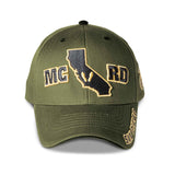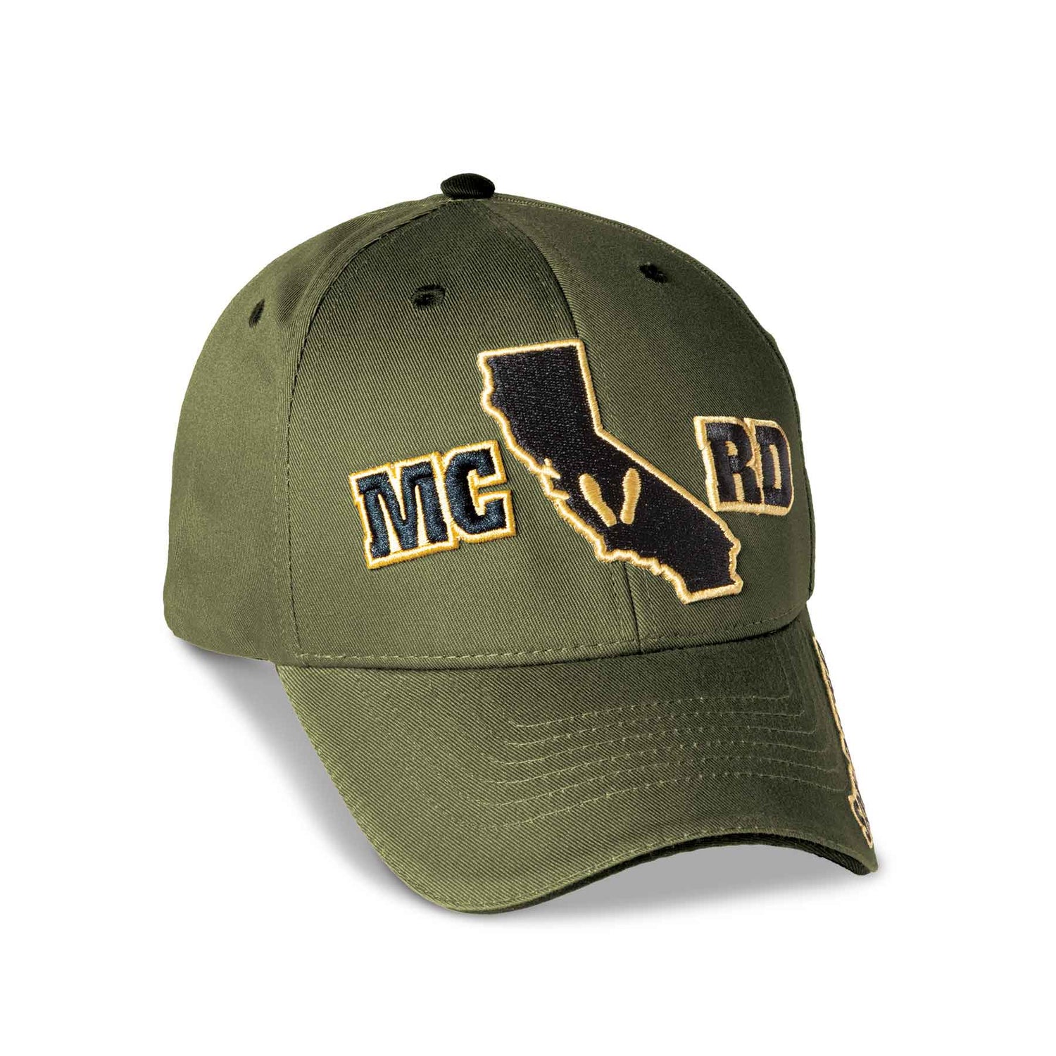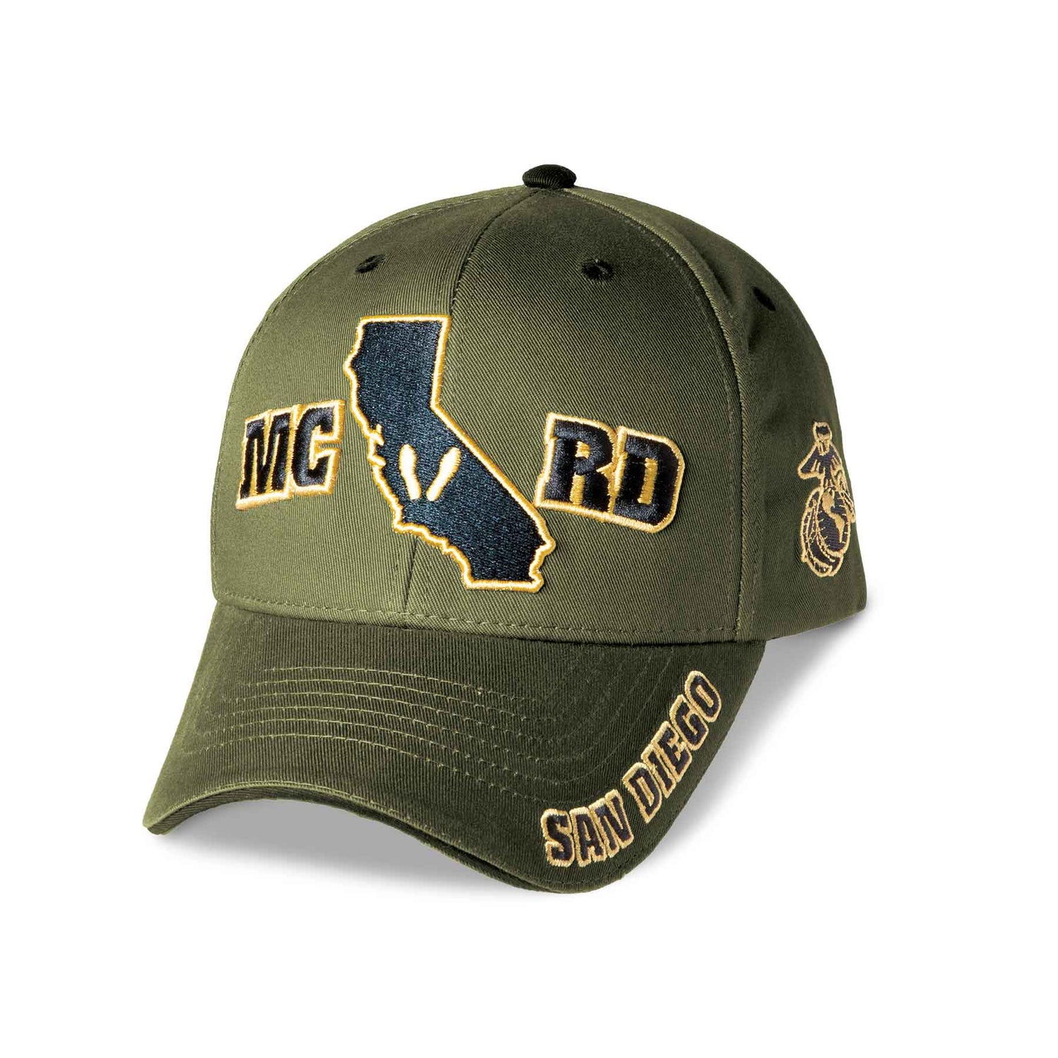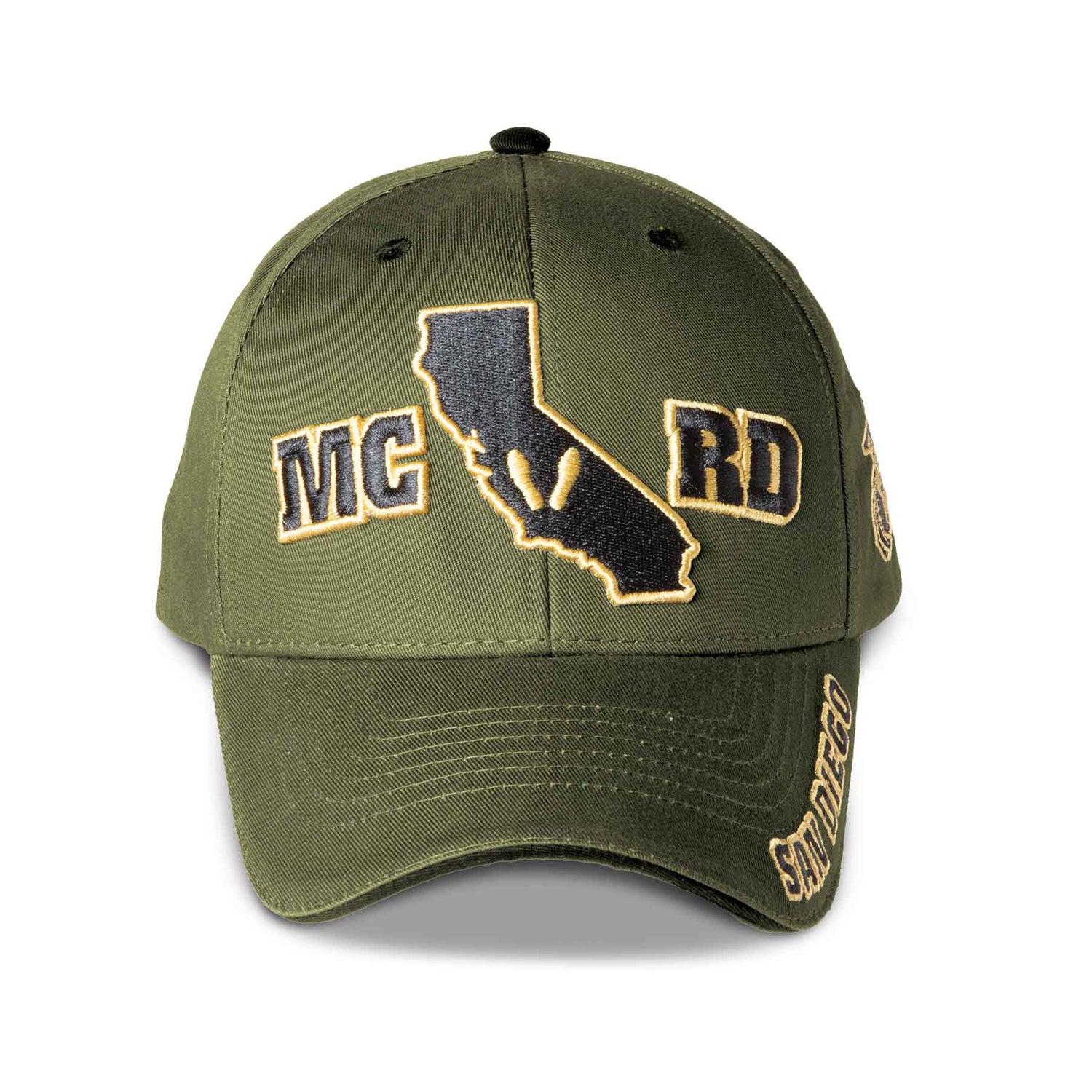 Show your Marine Corps pride with the MCRD San Diego Choose Your Rank/Logo Hat in OD Green. This durable and stylish low-profile cap features "MCRD" and the iconic yellow footprints within an embroidered outline of California on the front, honoring the legacy of Marine Corps Recruit Depot San Diego. Customize the design further by selecting your rank or a Marine Corps logo for the left side, creating a unique tribute to your service.