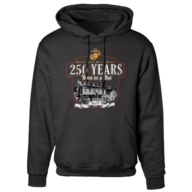 Honor 250 years of Marine Corps history with the USMC Born in a Bar 250 Years Hoodie. This officially licensed United States Marine Corps hoodie proudly features a bold design with a sharp image of the historic Tun Tavern, the birthplace of the Marine Corps, along with the phrases "250 Years" and "Born in a Bar." Crafted from a soft and durable 50% cotton, 50% polyester blend, it offers warmth, comfort, and long-lasting wear—perfect for cool weather, events, or casual days when you want to show your pride. Whether you're a Marine, veteran, or looking for unique gifts for Marines, this sweatshirt is the perfect way to celebrate the USMC 250th birthday and the legacy of the Corps.