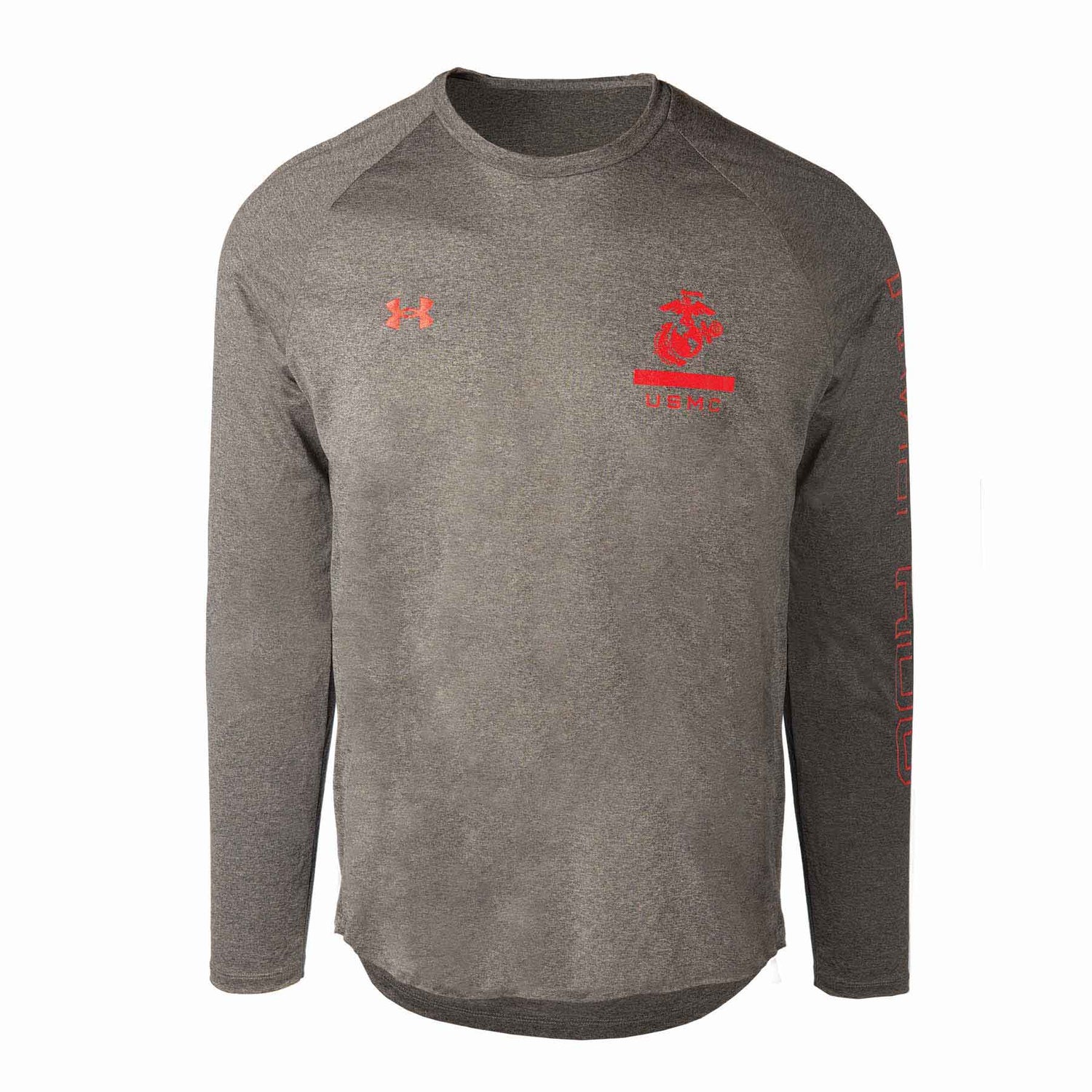 Display your USMC pride and commitment with the Under Armour Ooh Rah Long Sleeve Tech Tee, designed for optimal performance and comfort. This premium grey long sleeve t-shirt showcases a striking red Eagle, Globe, and Anchor emblem with "USMC" positioned beneath it on the front left chest. Additionally, the renowned Under Armour logo adorns the front right chest for an unmistakable touch of quality.