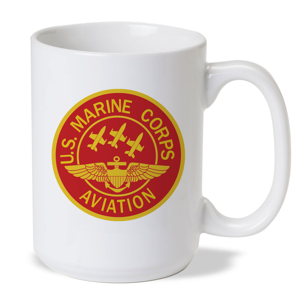 White coffee cup featuring the Red Marine Corps Aviation patch.