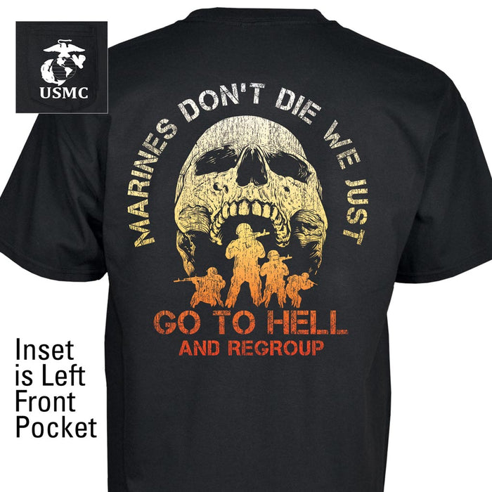 Show off your Marine pride with this Marines Don't Die Full Front T-shirt. This shirt features an exclusive design that reads "Marines Don't Die We Just Go To Hell And Regroup".