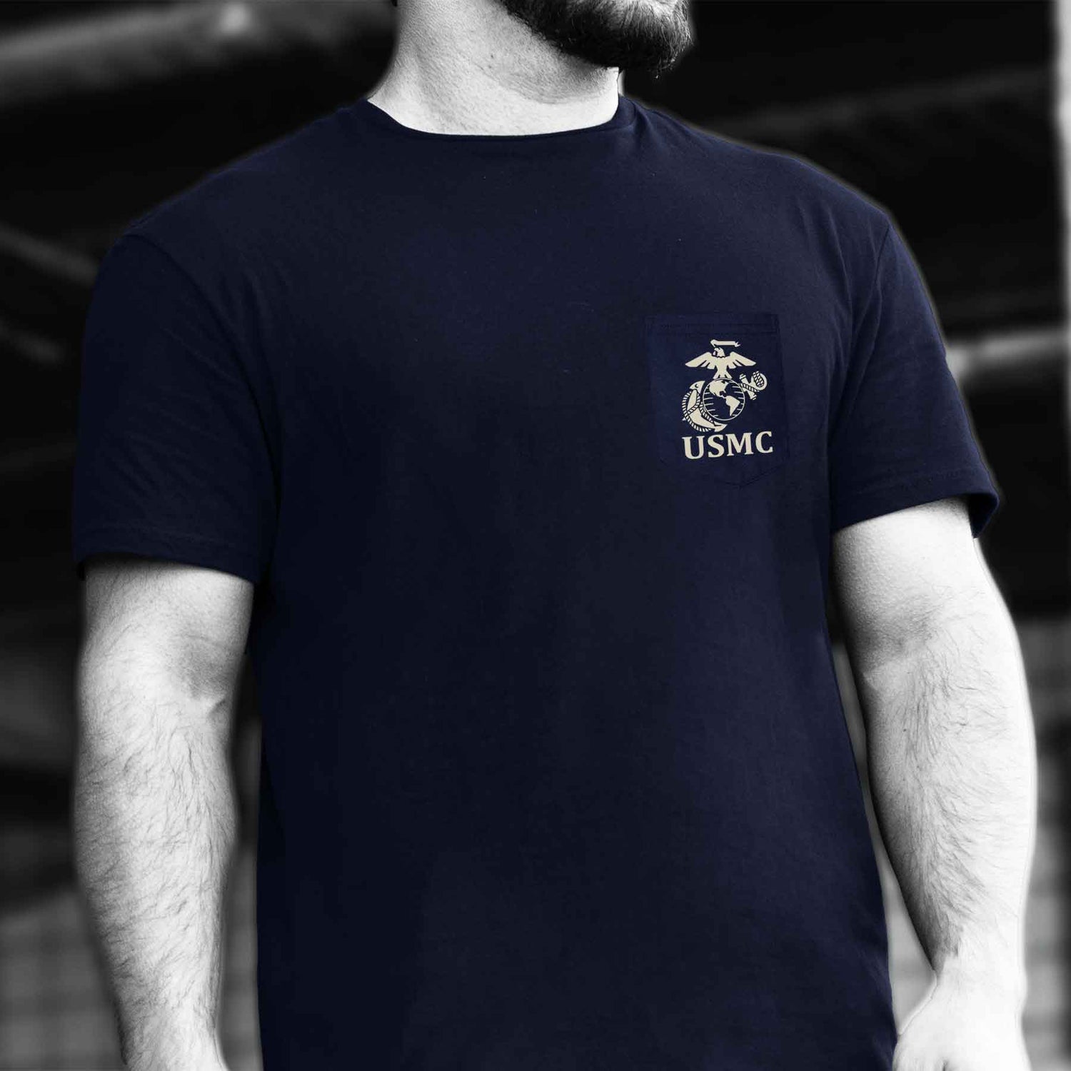 Continue to showcase your pride and dedication with this USMC Freedom Warriors Pocket T-shirt. This shirt features the American flag with the silhouette of Marine soldiers that reads "Freedom".