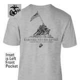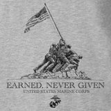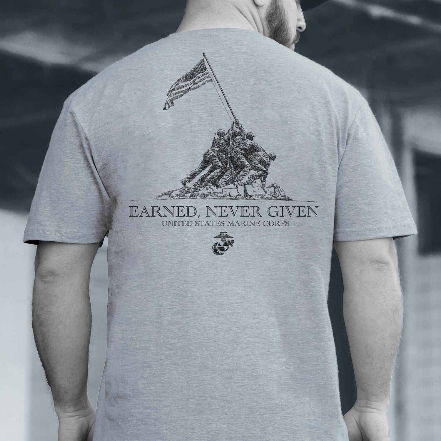 Featuring the stirring image of the iconic flag raising over Iwo Jima, this tee is a powerful reminder of the sacrifice and endurance intrinsic to the Marine spirit. Accompanied by the potent phrases "Earned, Never Given" and "United States Marine Corps," it resonates with the core principles that define the Corps' heritage.