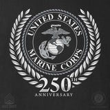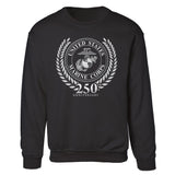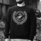 Celebrate Marine Corps heritage with the USMC 250th Anniversary Grayscale Sweatshirt. The design honors the 250th Birthday of the United States Marine Corps, featuring the official USMC seal and "250th Anniversary" in a bold grayscale style, symbolizing strength and tradition.