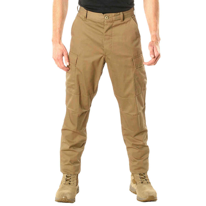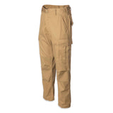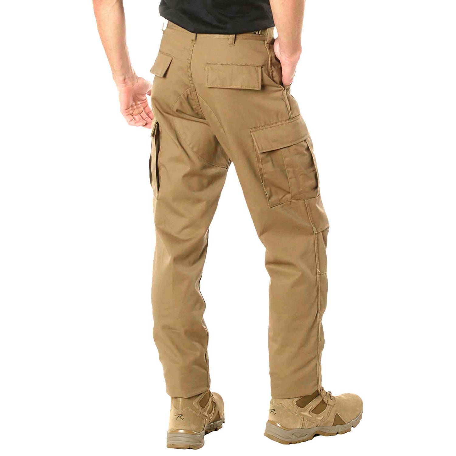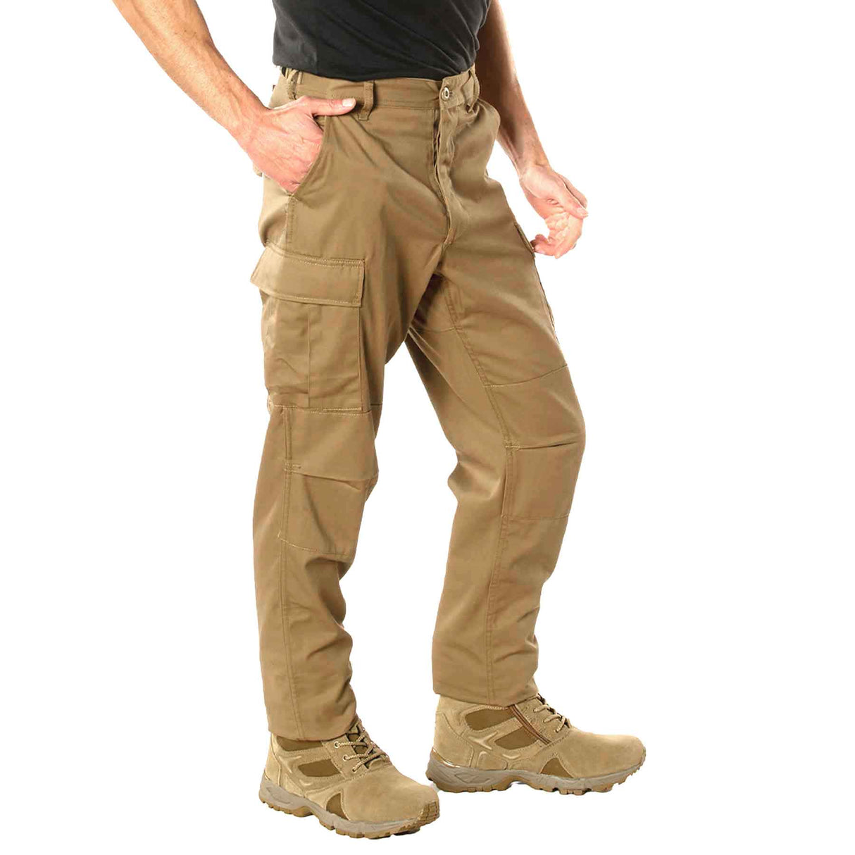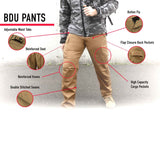 Modeled after the U.S. Military's Battle Dress Uniform, these tactical cargo pants are ready for battle or battling the everyday. Two side pockets, two cargo pockets, and two button-down back pockets. Adjustable waist tabs. Military button fly. Durable reinforced seat and knees. Drawstring bottoms. All weather.
