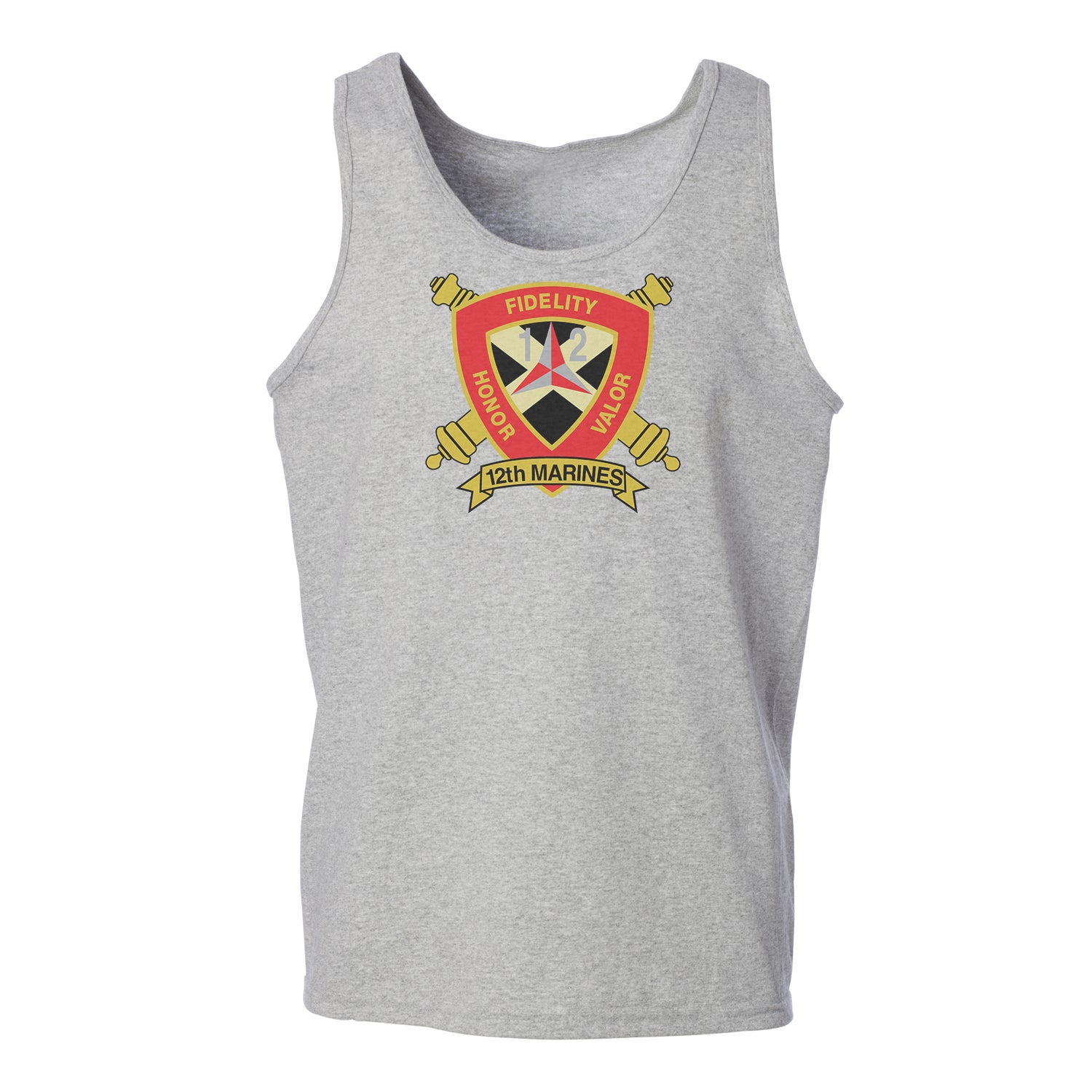 Your USMC collection won't truly be complete until you add this great Tank Top. This shirt features the 12th Marines Regimental patch and can be personalized with your location and year.